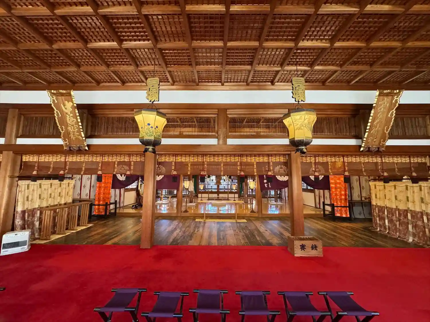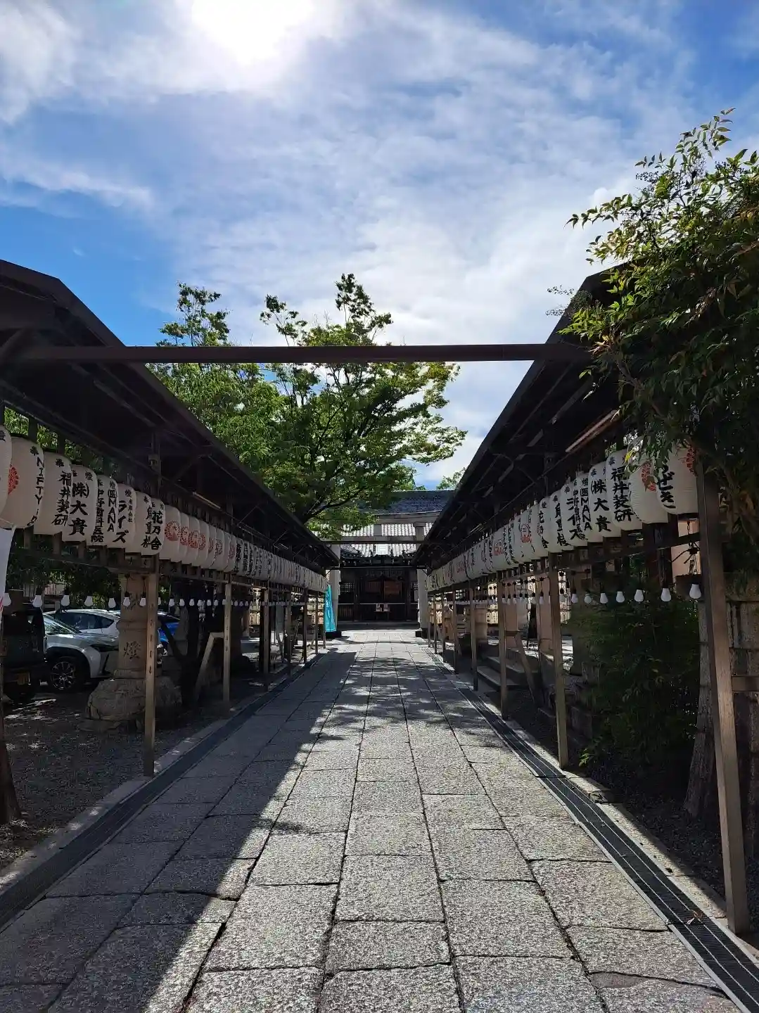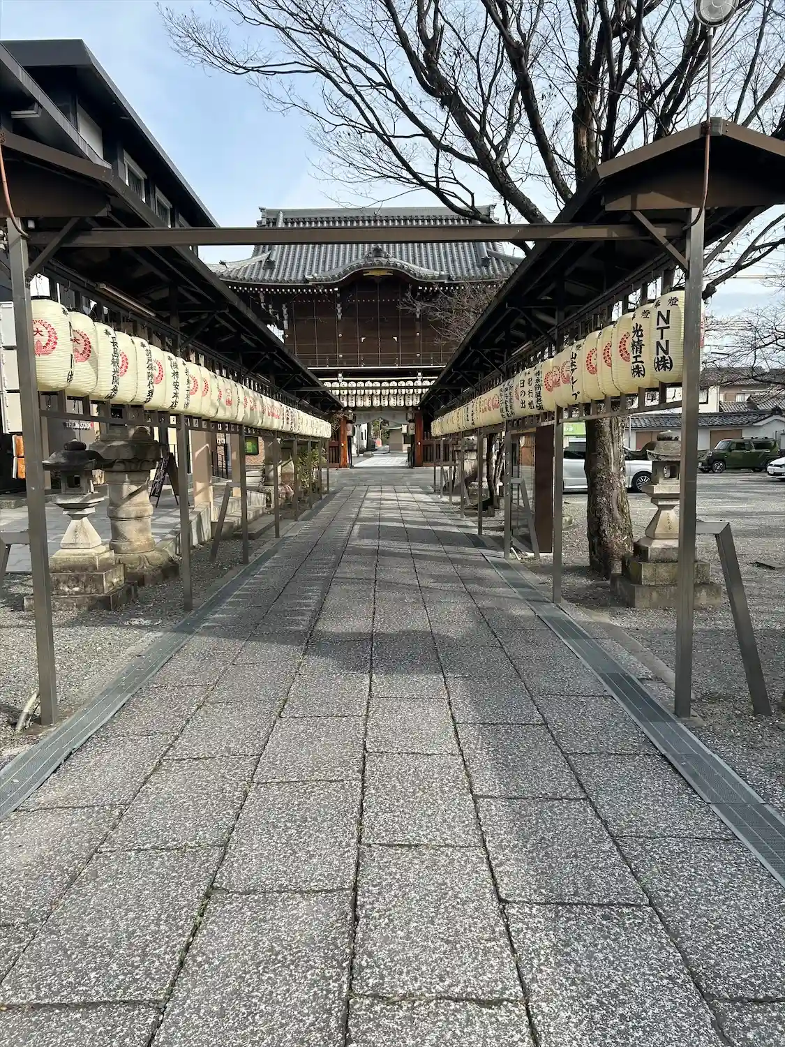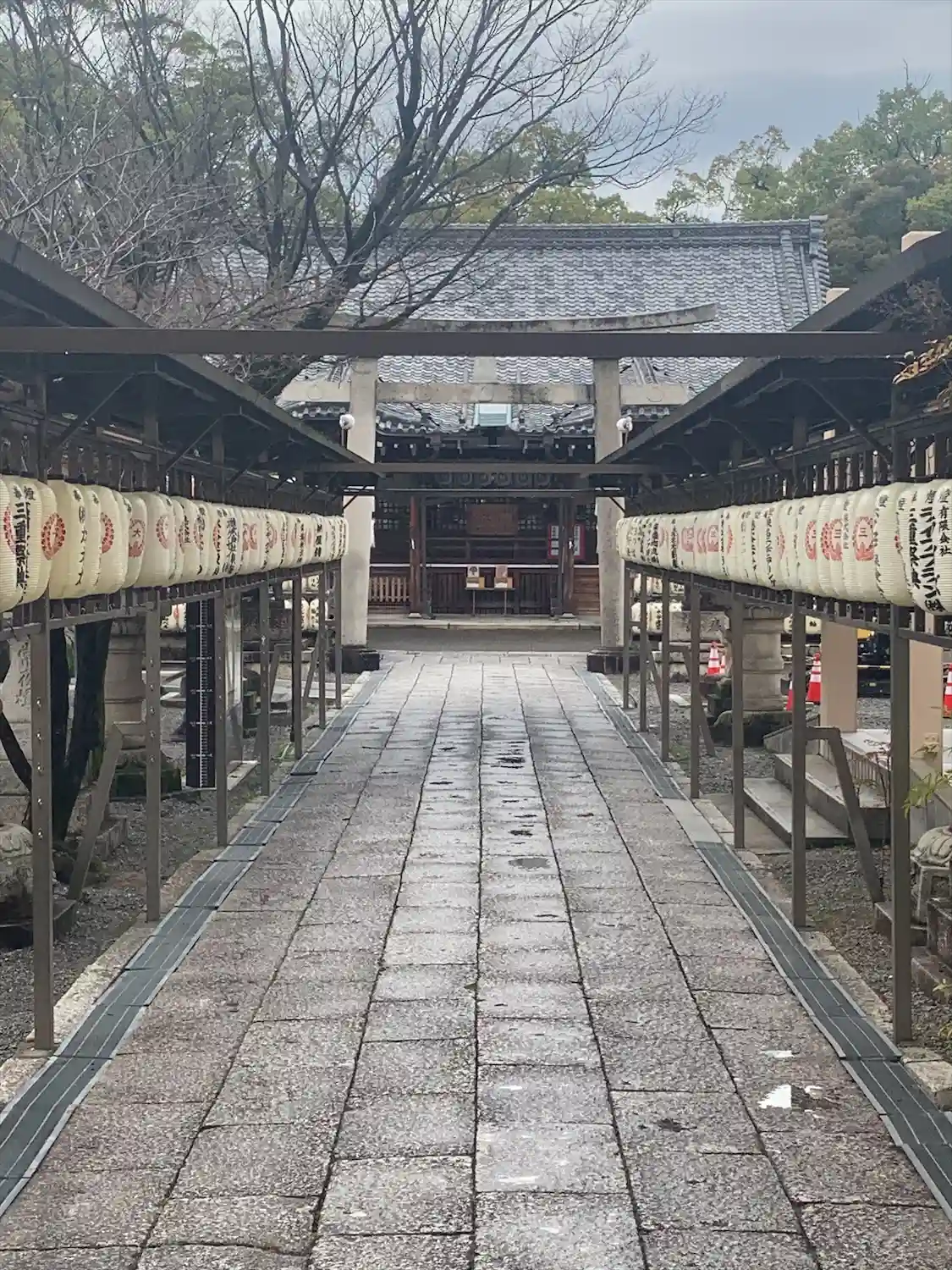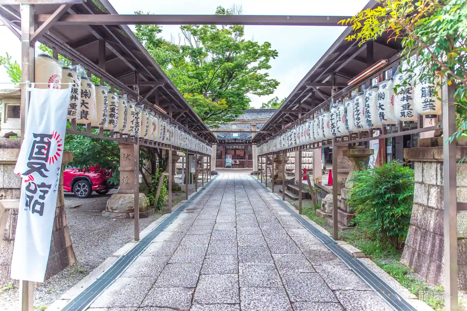 拝殿までまっすぐに伸びる参道。両側には奉納提灯がずらっと並んでいる。