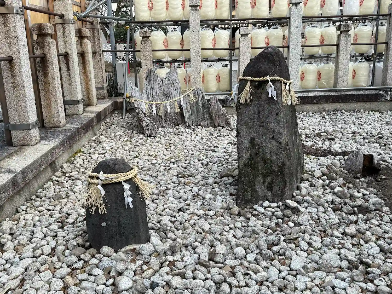 <桑名神社>参拝口前にある庭の石群と古切株。