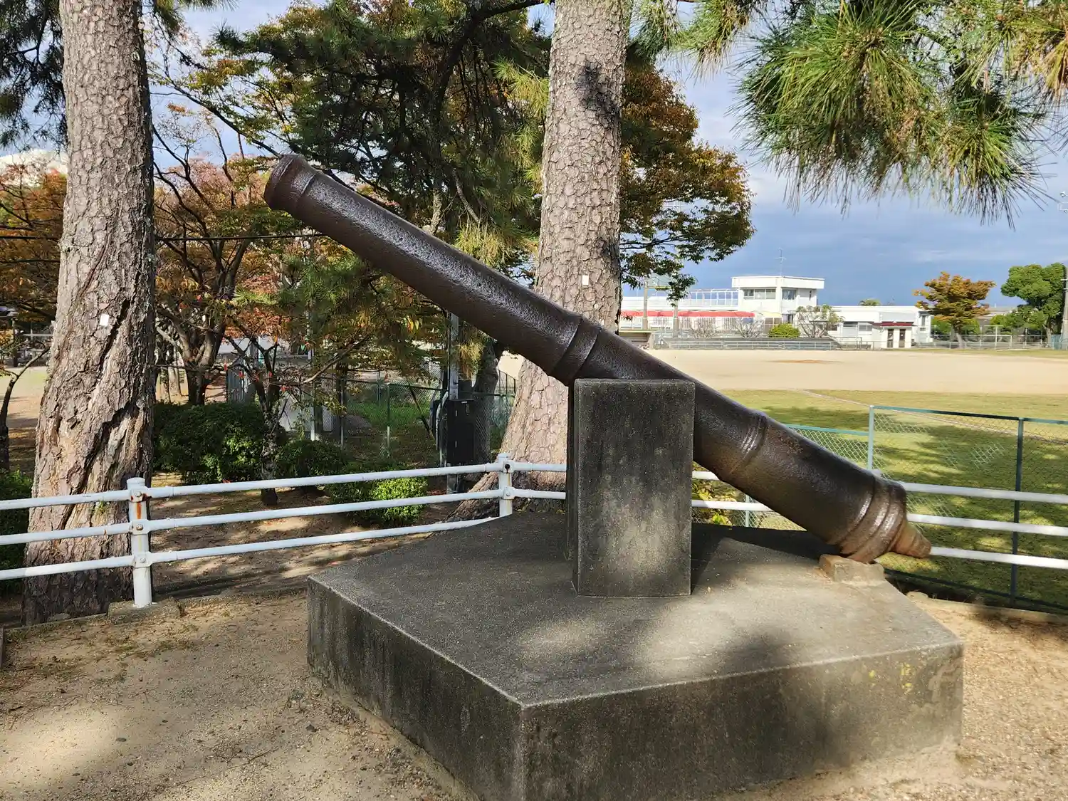 明治20年(1887)戊辰戦争の戦没者のために旧藩主松平定敬の撰書により建立された剣の形をした青銅の碑です。縮小規模で再現された天守閣跡地にあります。