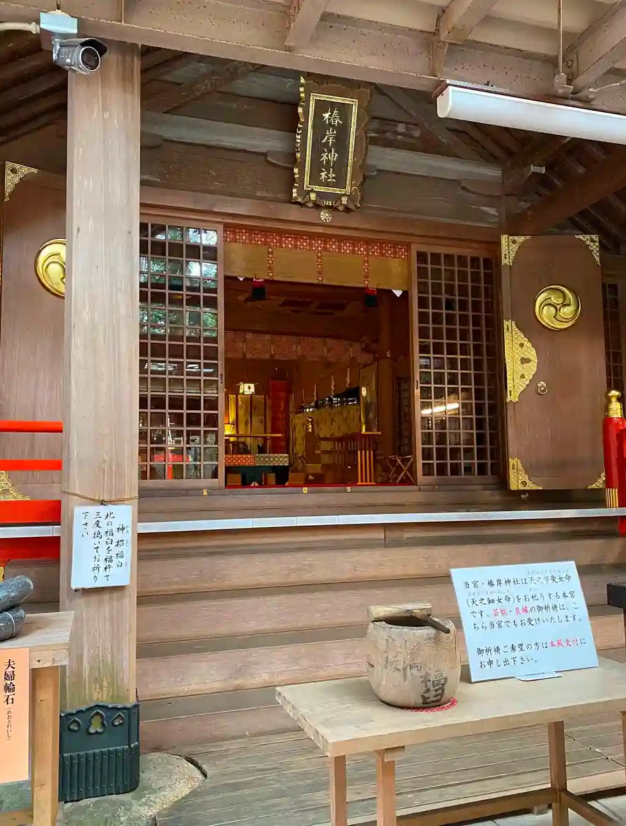椿岸神社拝殿。拝殿前には<神招福臼(かみおきのふくうす)>や<夫婦輪石(めおとわいし)>などの良縁の品が置かれている。