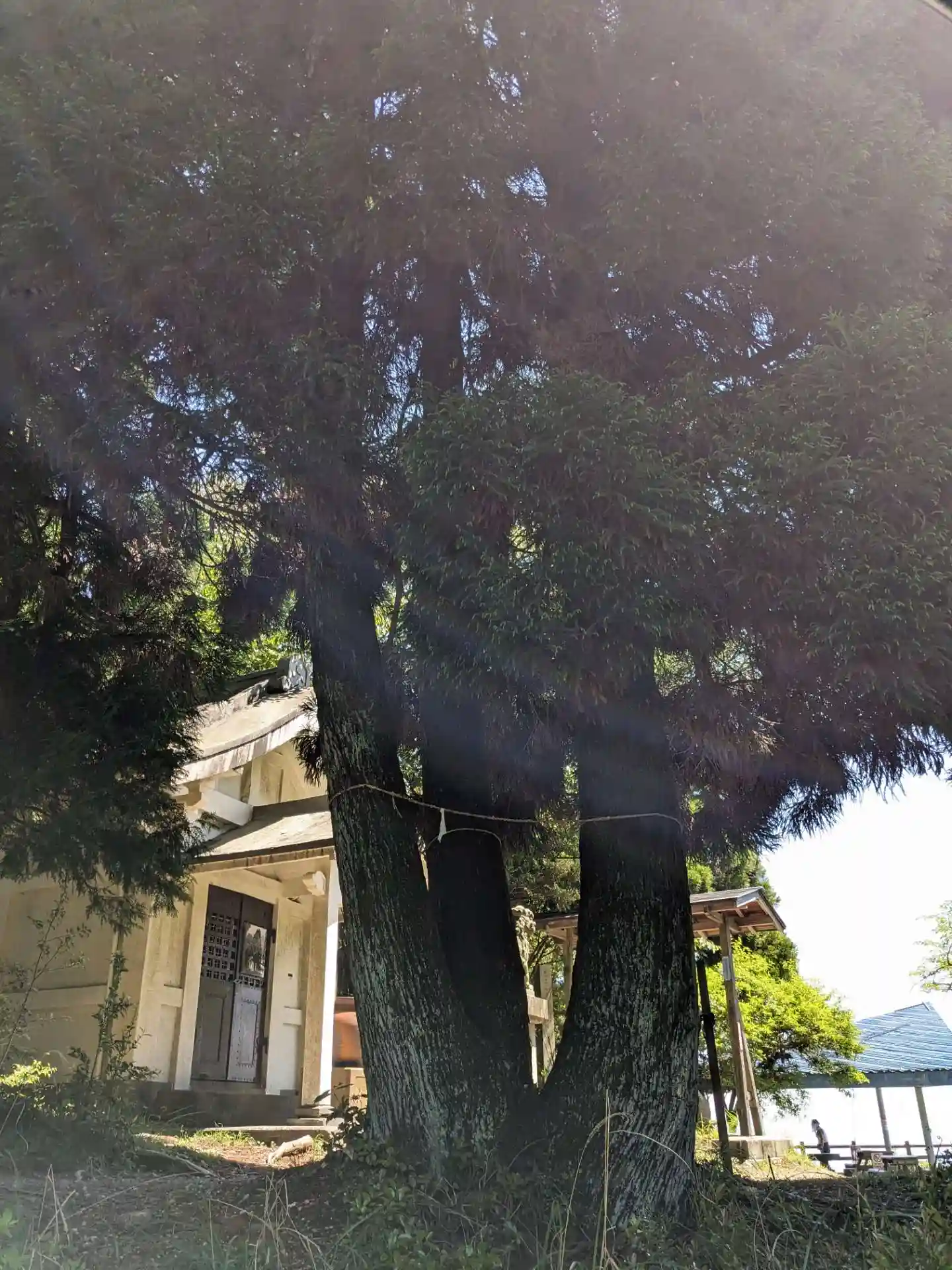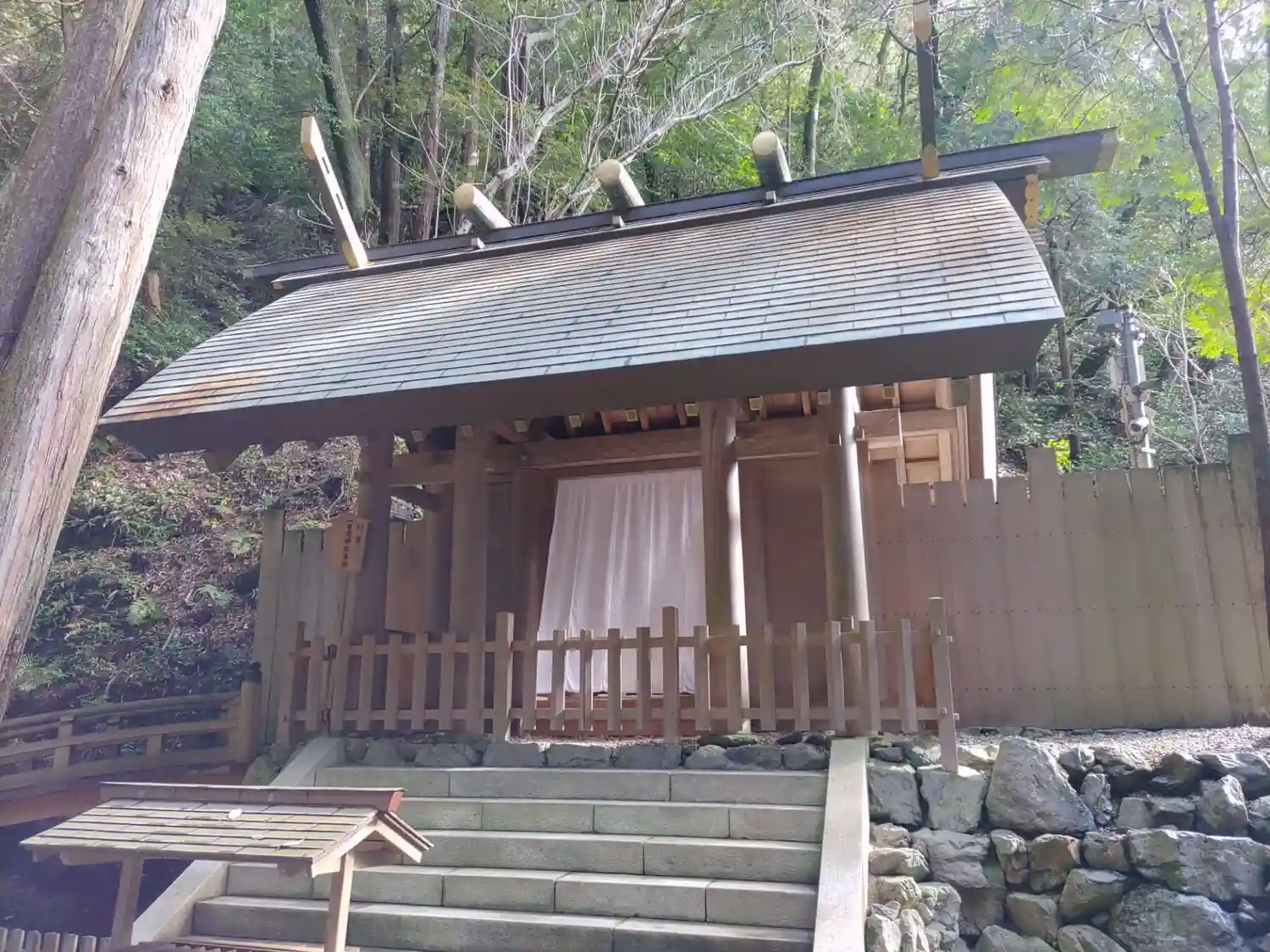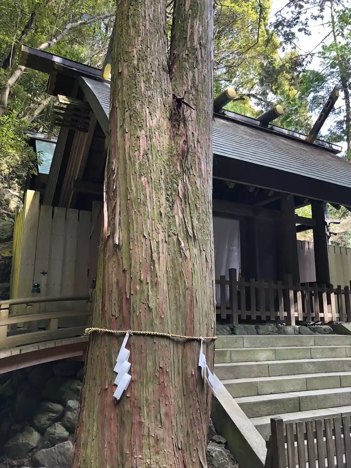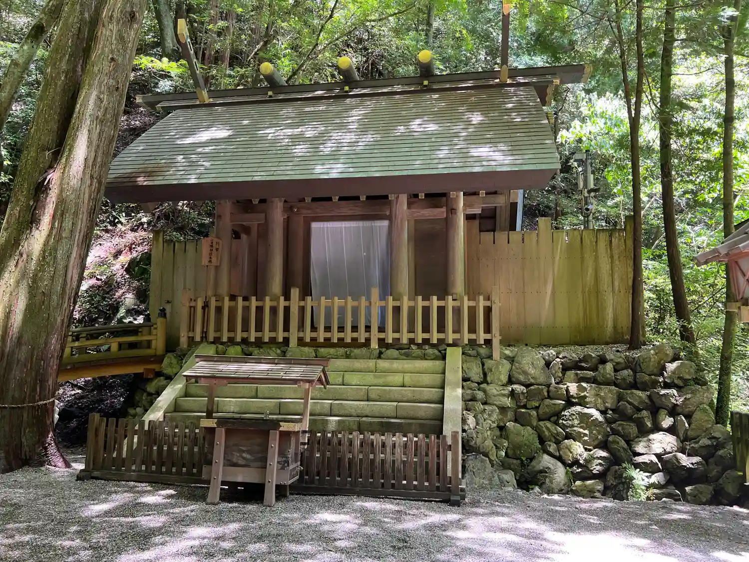 御神木の裏手に用途の分からない、不思議な建物が建っている。後で調べたら<多度祭御殿>といって、当社の<上げ馬神事>の際に、馬に乗った騎手がこの坂を頂上まで駆け上るのを間近で見物する場所とのこと。なるほど!