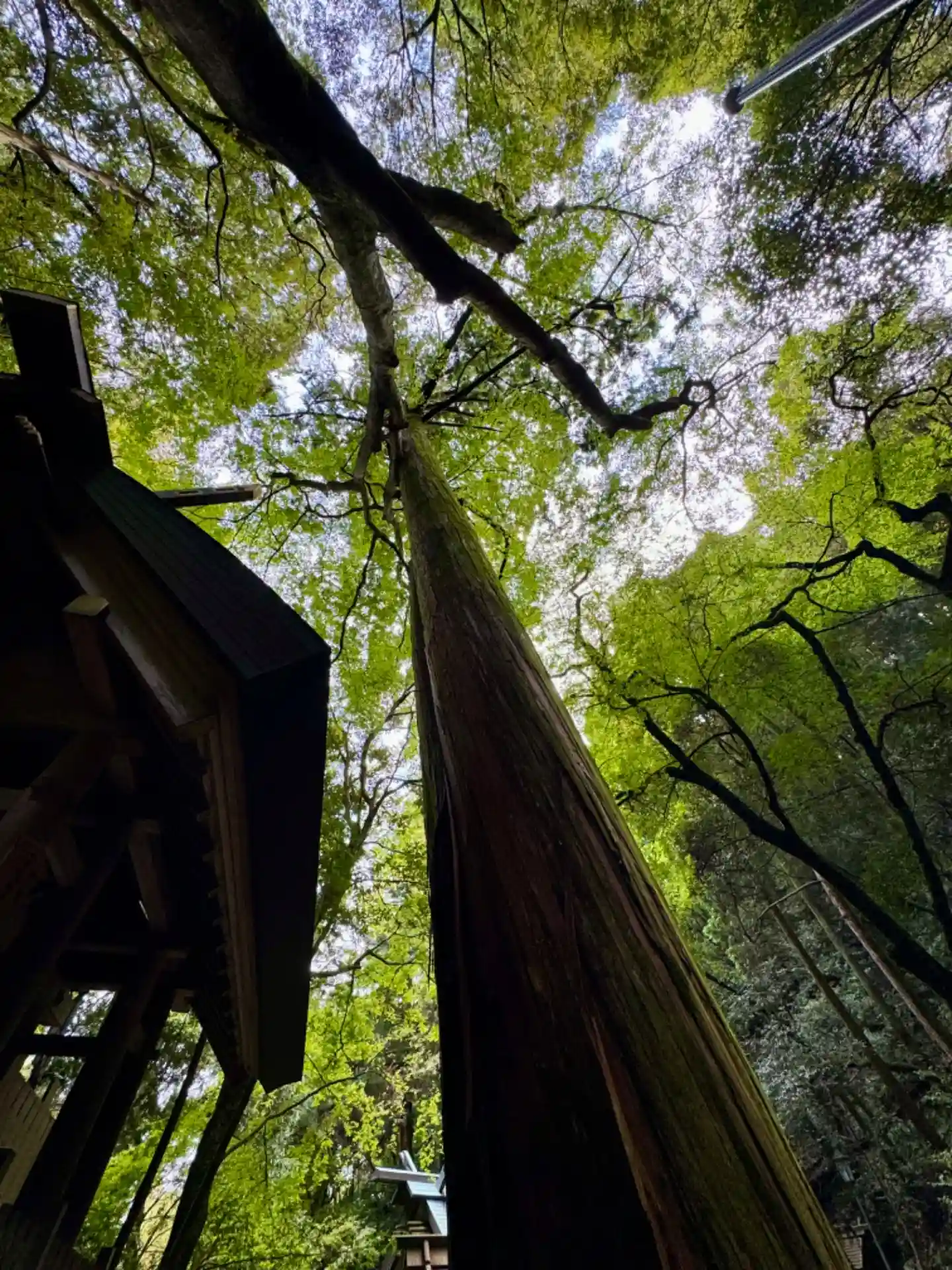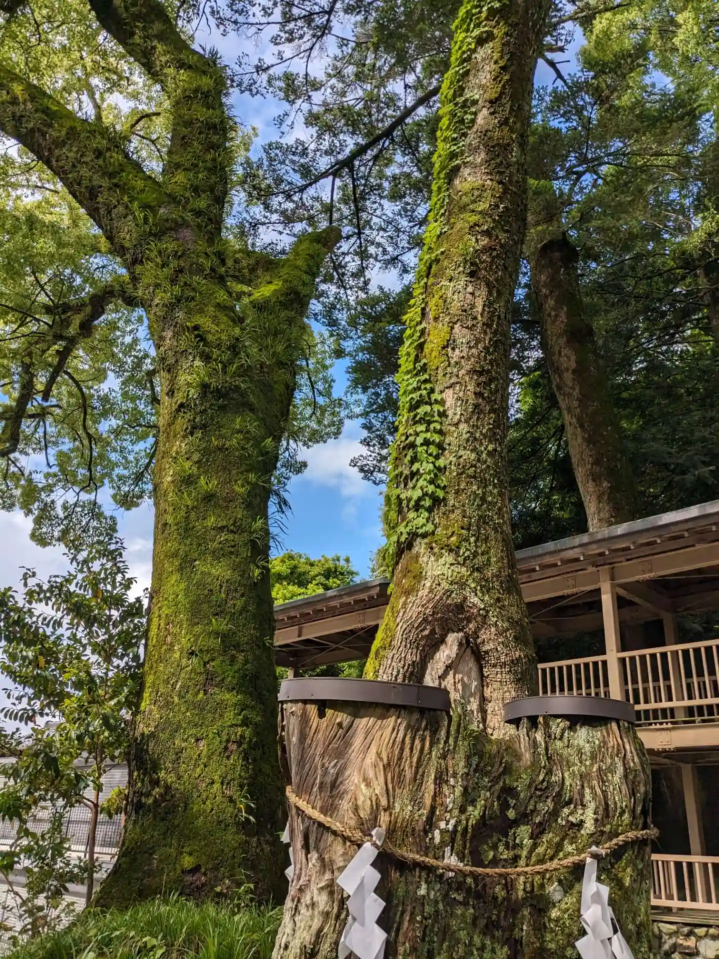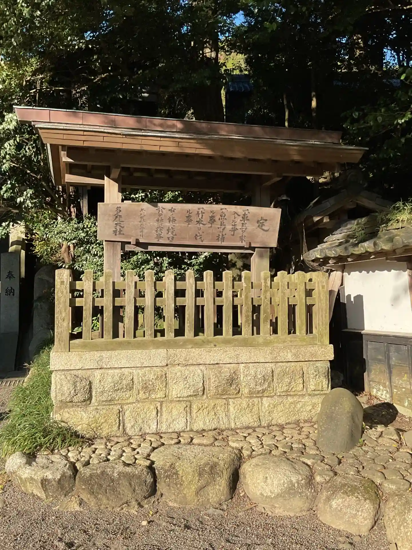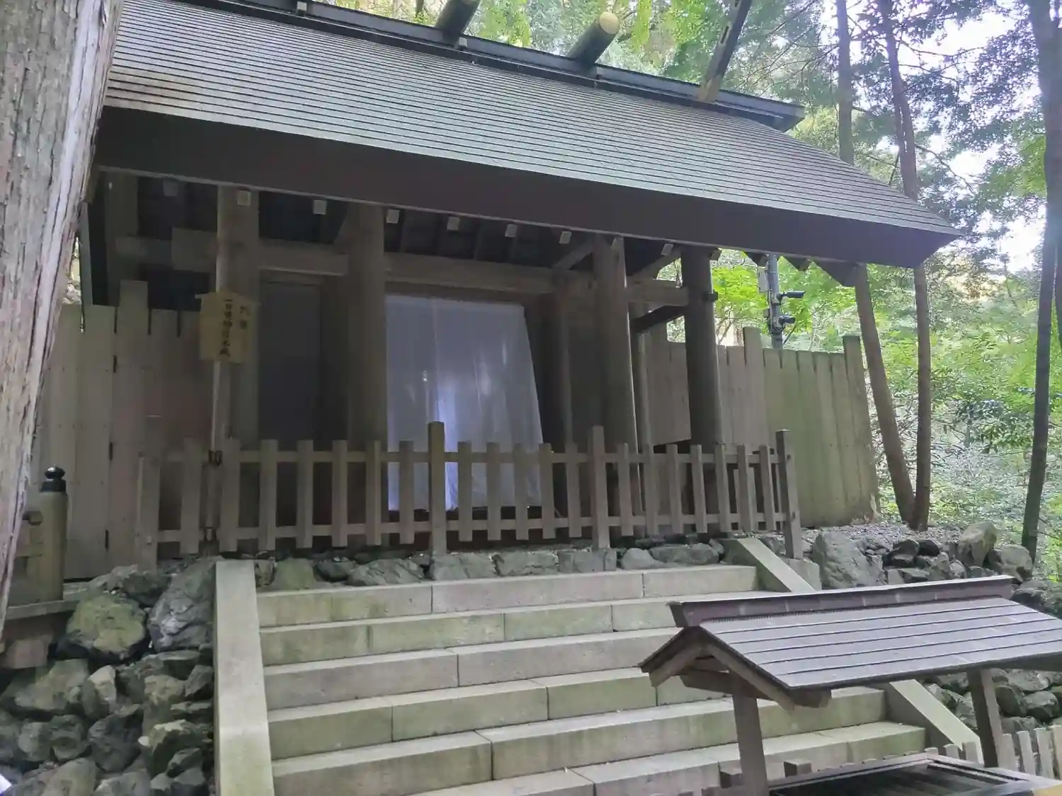 御神木の裏手に用途の分からない、不思議な建物が建っている。後で調べたら<多度祭御殿>といって、当社の<上げ馬神事>の際に、馬に乗った騎手がこの坂を頂上まで駆け上るのを間近で見物する場所とのこと。なるほど!