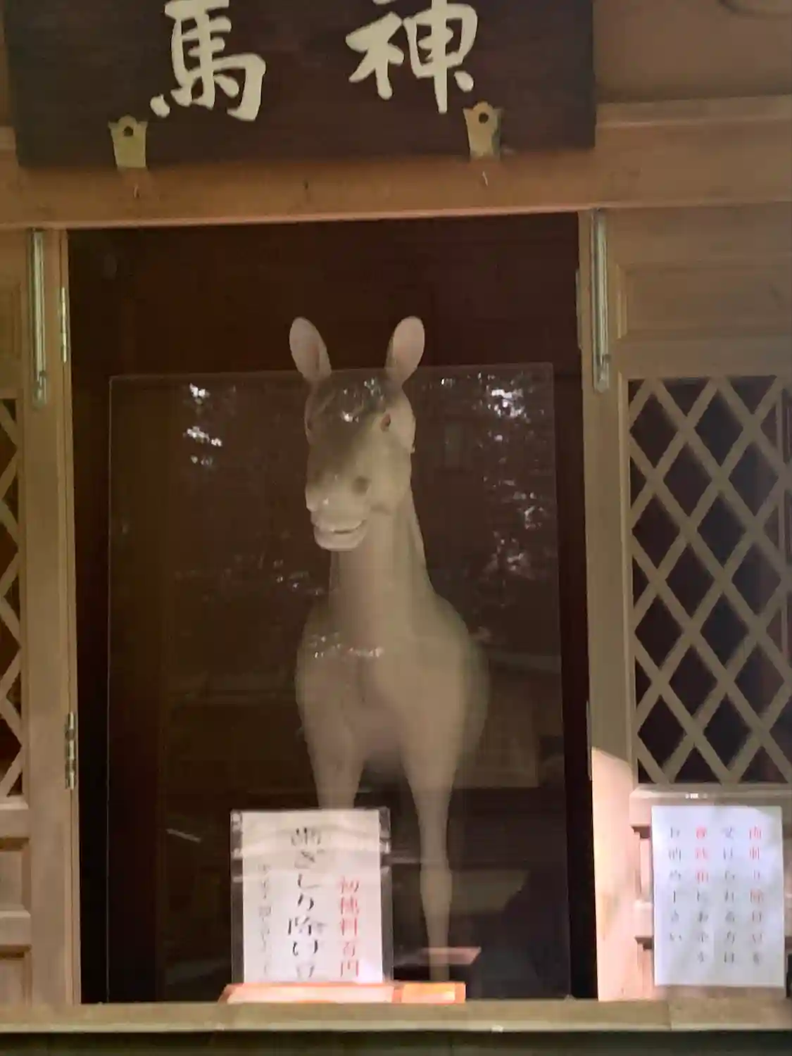 白馬舎です。白馬伝説に因んだ白馬が納められています。こちらの馬は作り物です。
