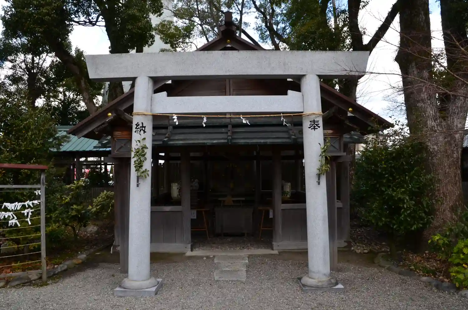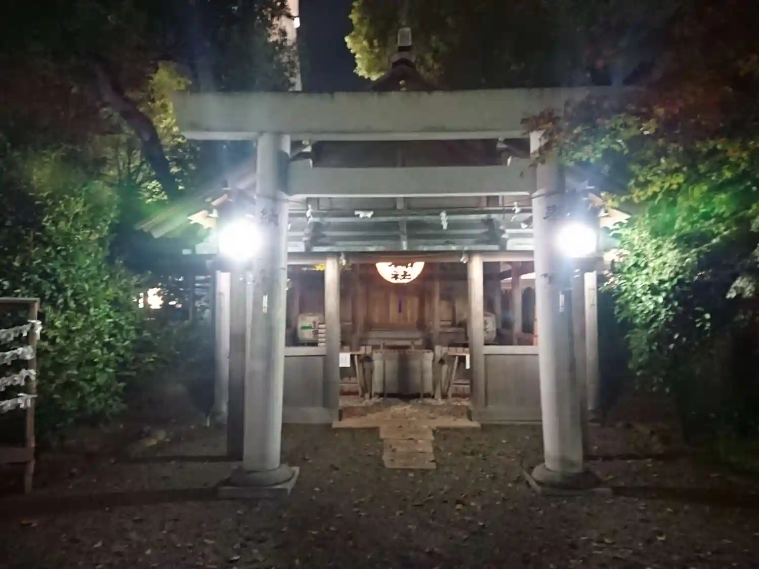 伊勢市駅前で木々に囲まれています。暗くなってからも境内には明かりがあり、お参りできます。