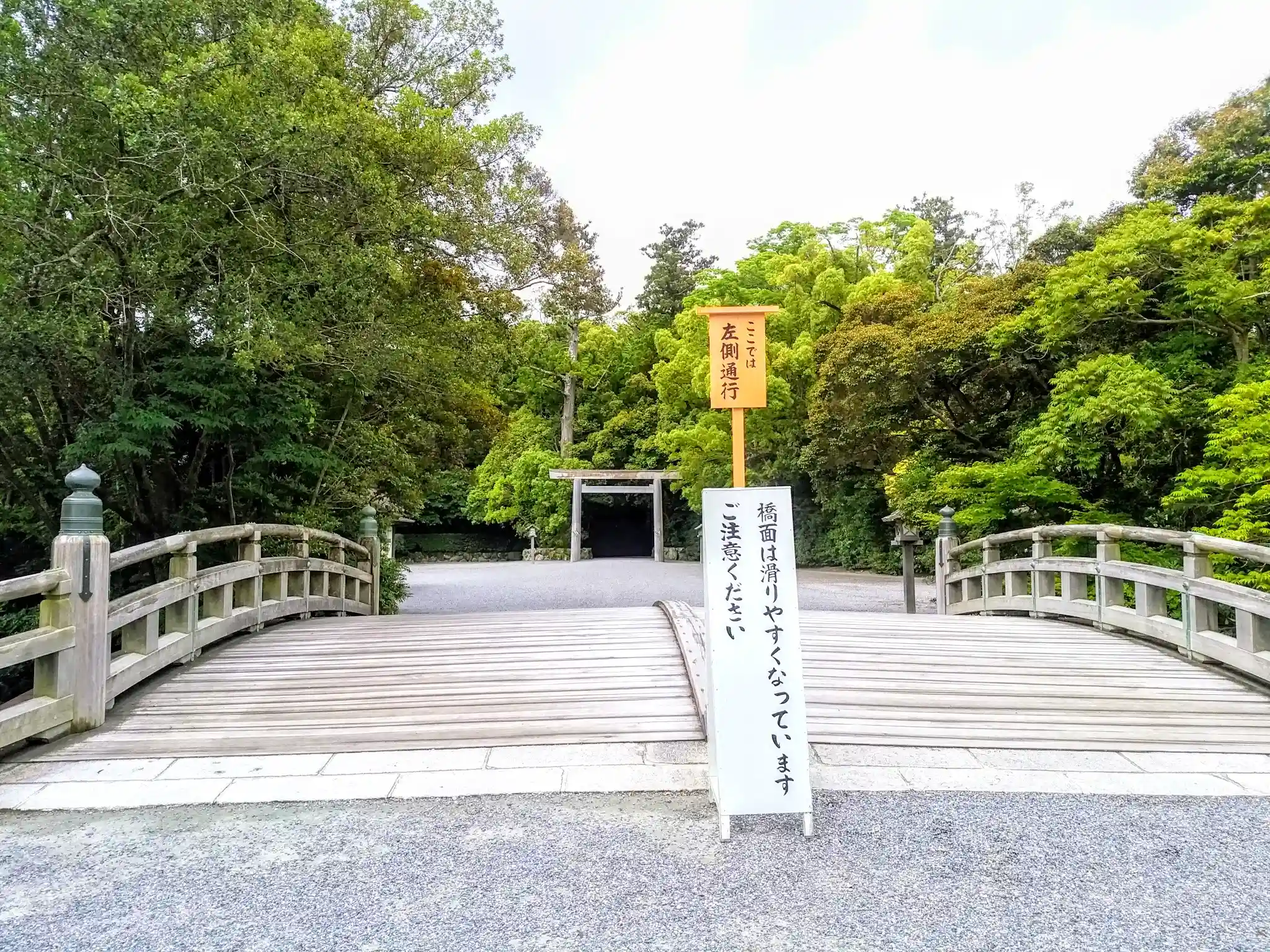 表参道火除橋 昔は、橋の近くまで民家がありました。川が火災を防ぐ役目をしていたんですね。外宮は左側通行です。なぜなら手水舎が参道の左側にあるから。参道の真ん中は歩いてはいけないのですが実は横切ってもいけないのです。