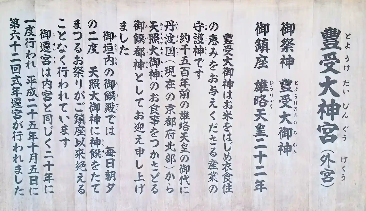 超簡単な由緒板 天皇に追い出され天照大御神は日本武尊のおばちゃんである倭姫命の力をかり優良物件を探すべくあちこち見て廻りました。やっとのことで見つけたのが、ここ伊勢の国だったのです。それから500年後、「丹羽の国に料理のうまい神さんがおるで連れてりゃ。」と、ヘッドハンティングされたのが豊受大御神だったのです。