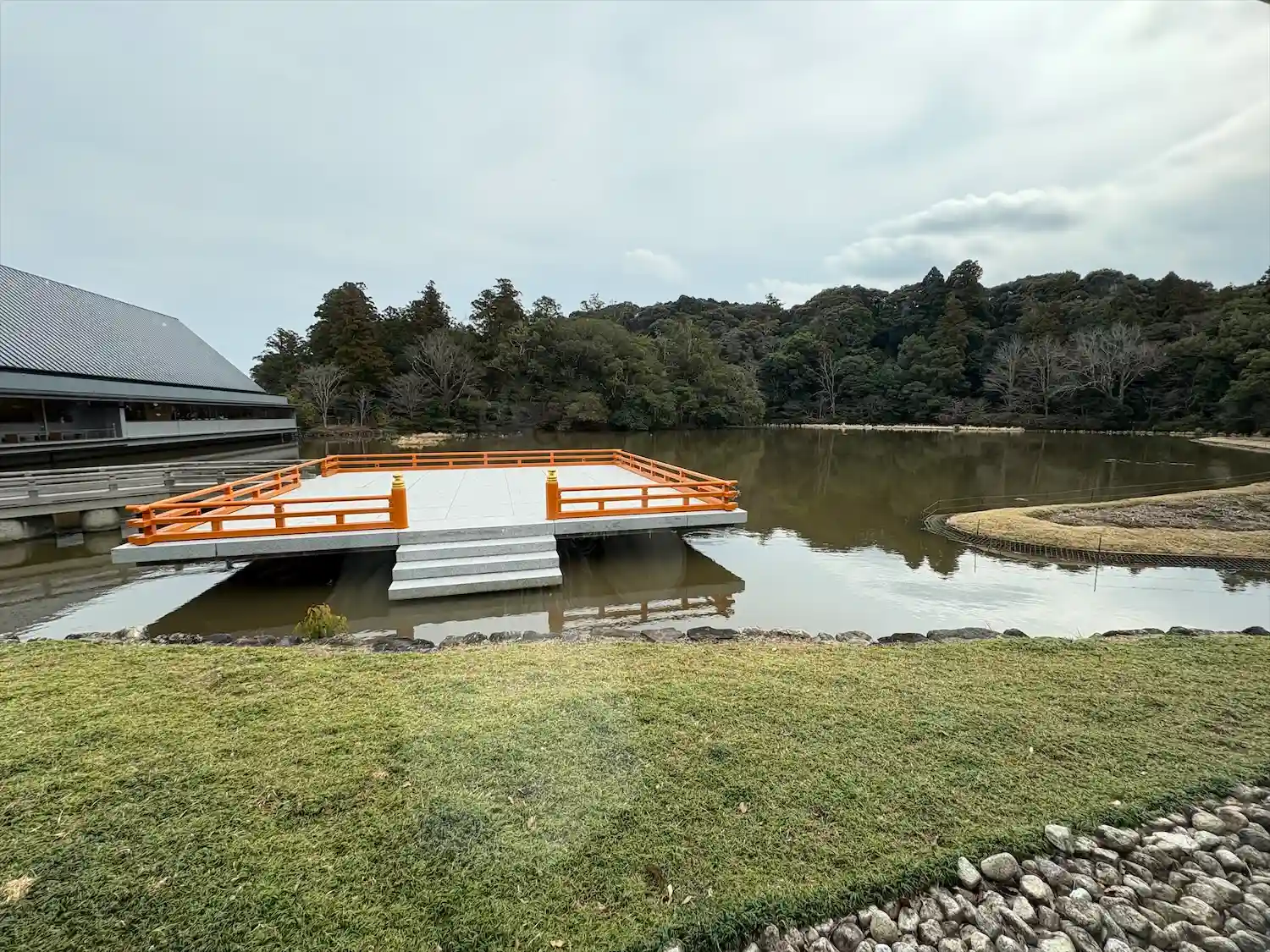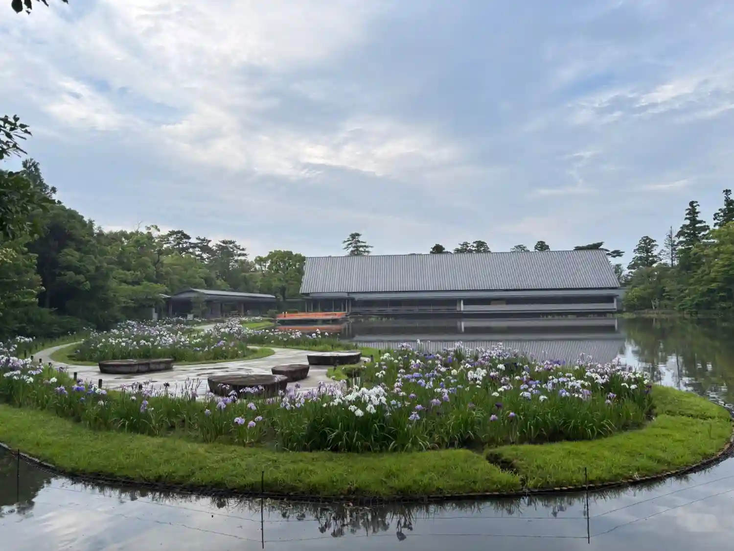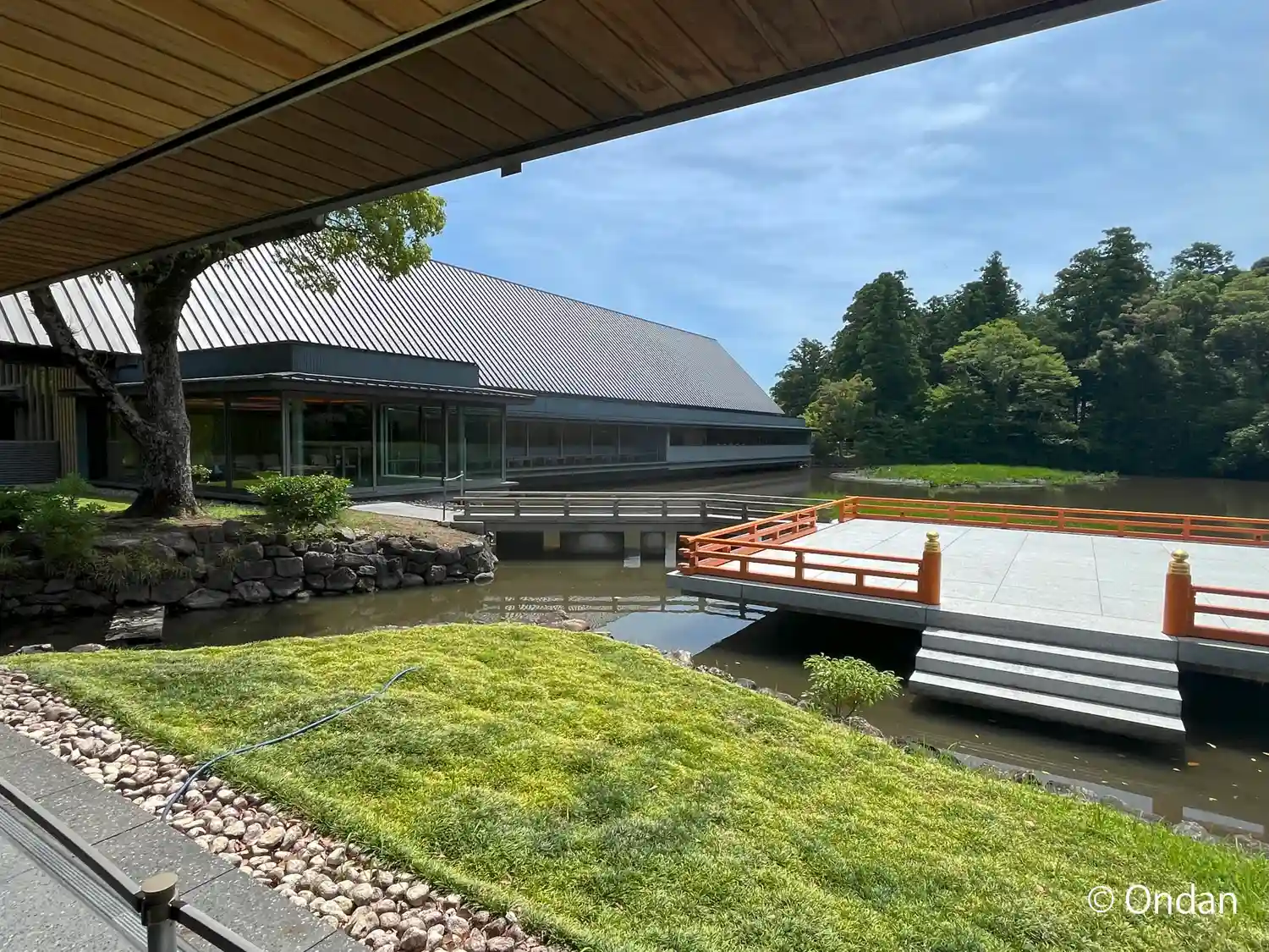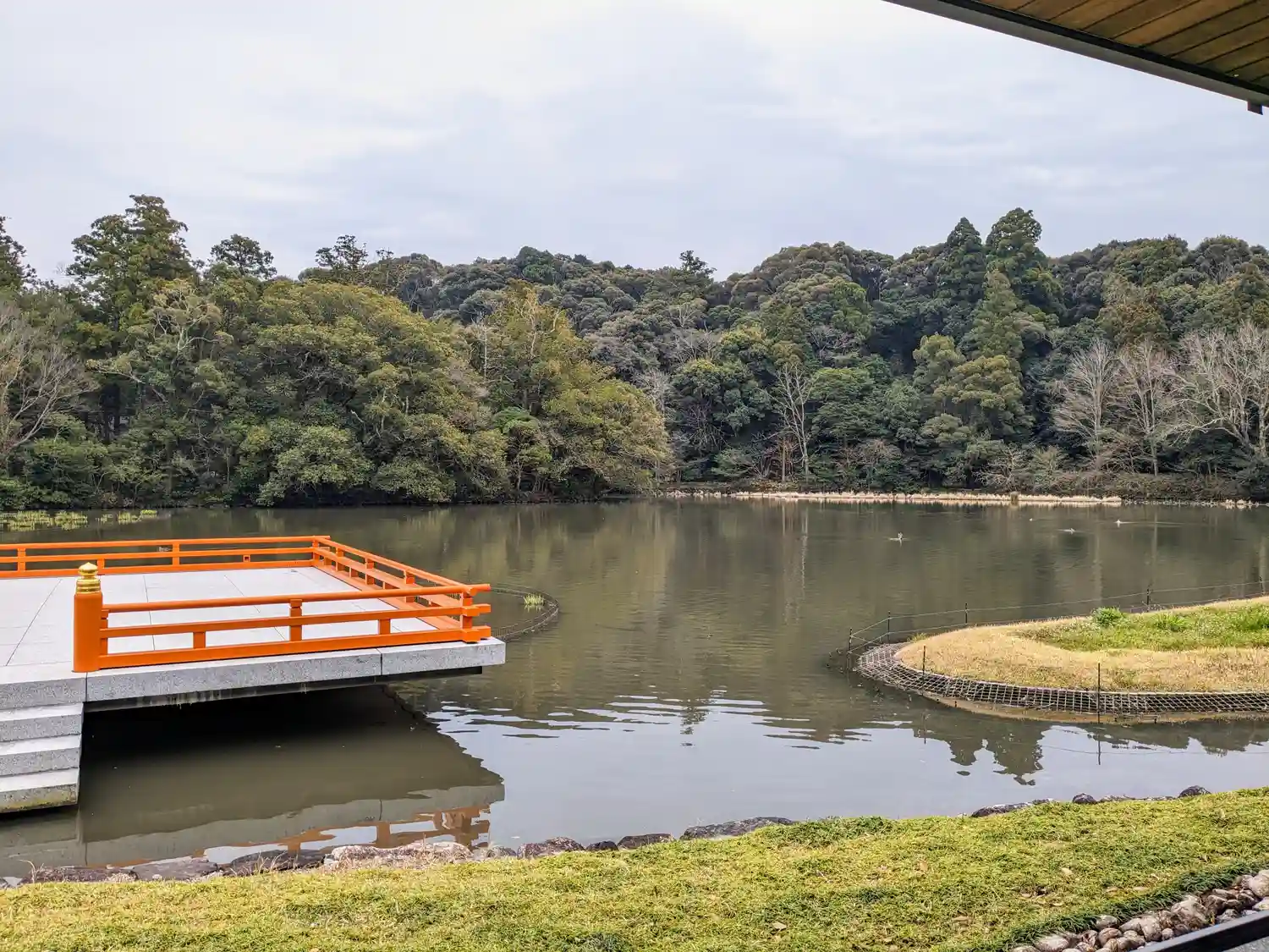 エアコンの効いた室内でベンチに座り、勾玉池を眺めながらゆっくり休憩できました。