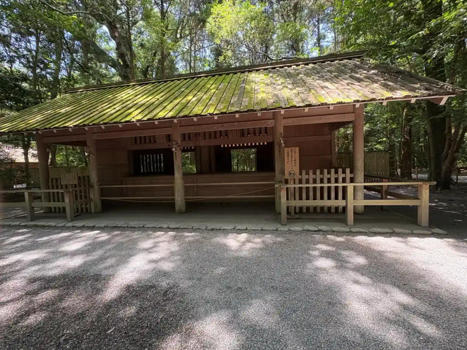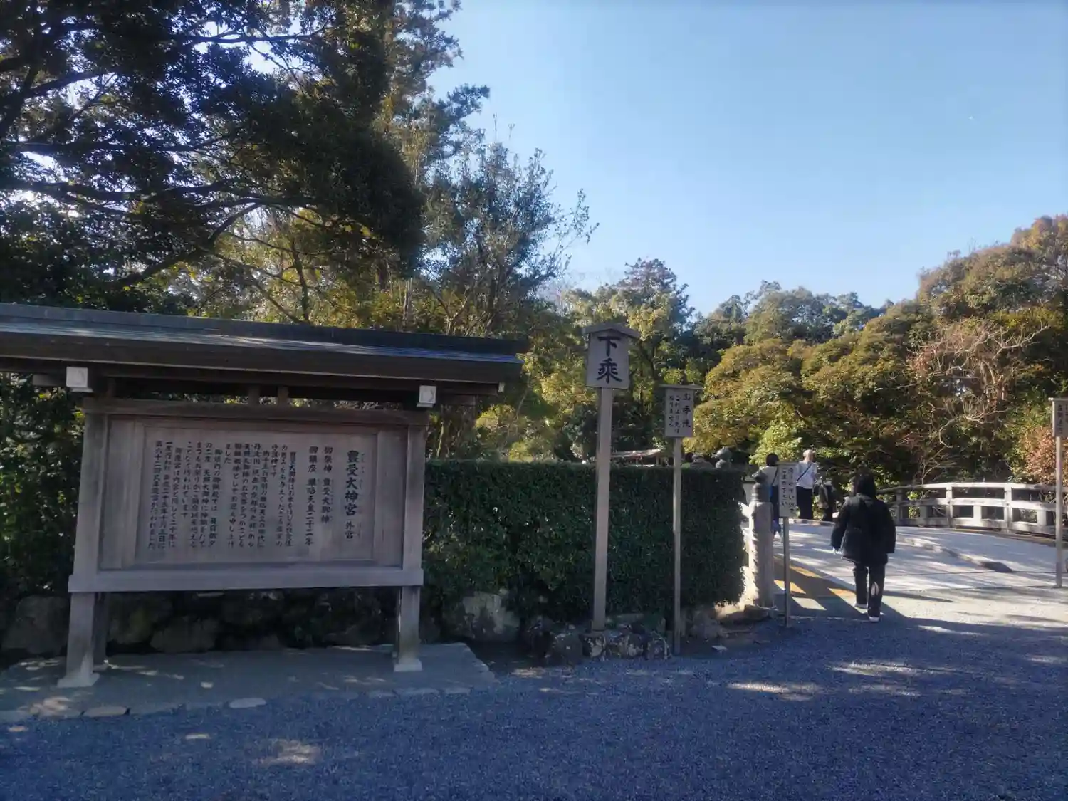 火除橋。外宮を取り囲むように堀があり、そこにかかる橋を渡って神域に入っていきます。立て札には「左側通行」と書かれており、内宮とは逆なのが面白いです。