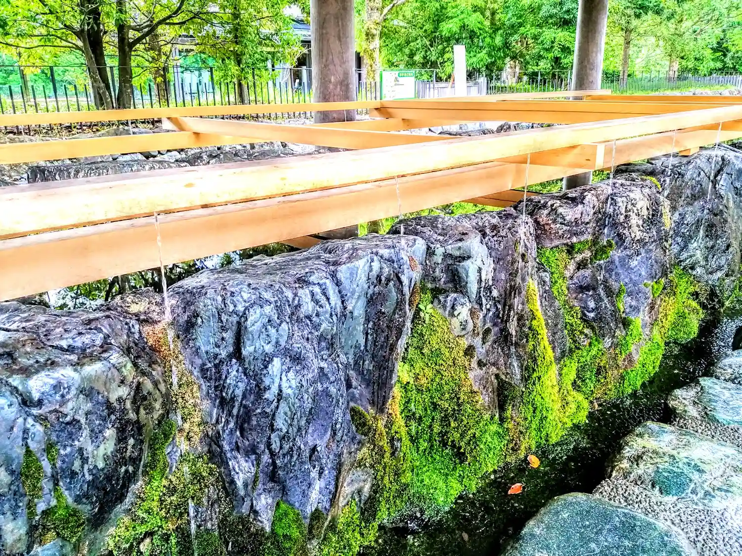 水路にかかる石橋は通称「亀石」と呼ばれています。このアングルで橋から突き出る部分が亀の頭に見えてきます。