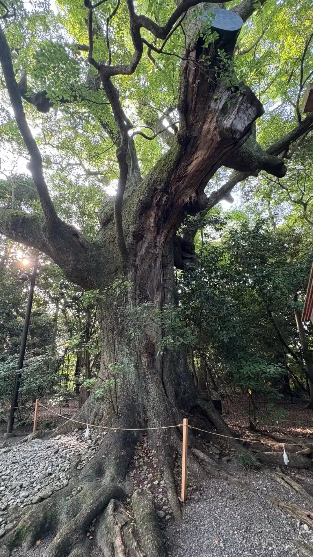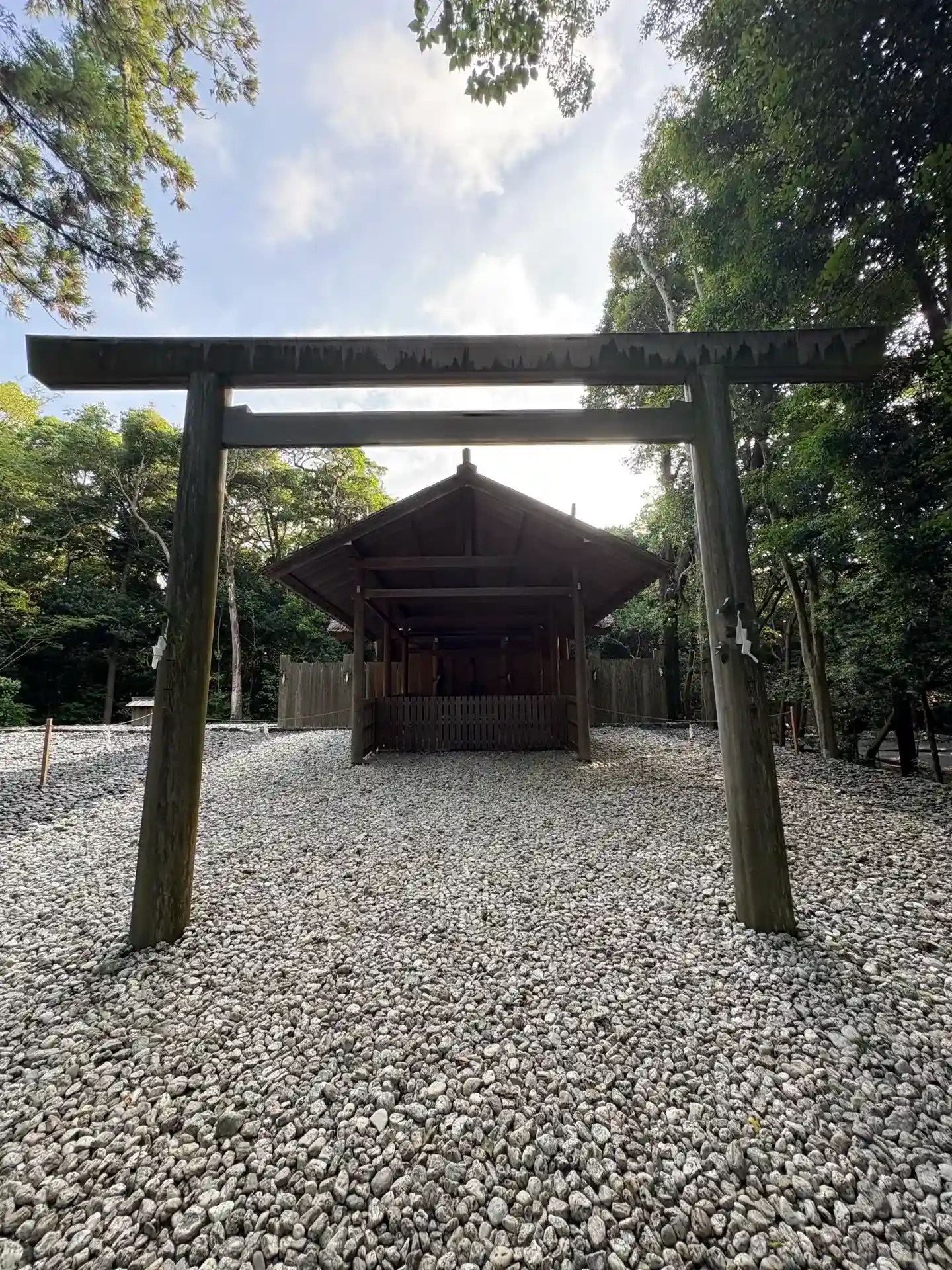 早朝の人通りのない外宮参道から徒歩で月夜見宮へ。朝日が月夜見宮を背後から照らす…神々しい光景でした。
