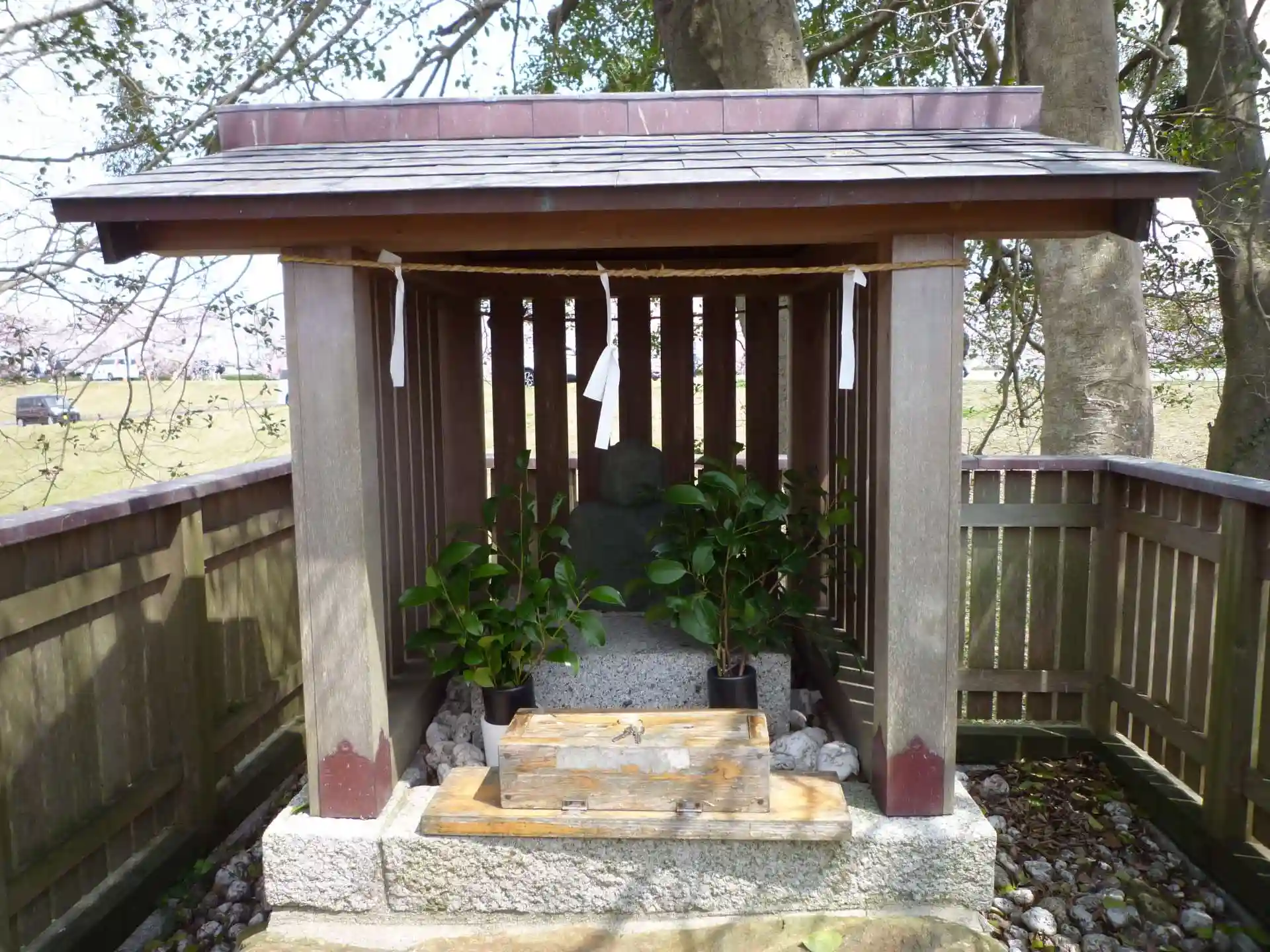 伊勢市度会橋東詰から宮川堤右岸を上流に300mほどの浅間堤に鎮座されています。 江戸時代に、毎年洪水を起こしていた暴れ川・宮川から田畑や家を守ろうと、自ら人柱となった庄屋・松井孫右衛門。その功績から神様として祀られ、石碑と社が建てられています。