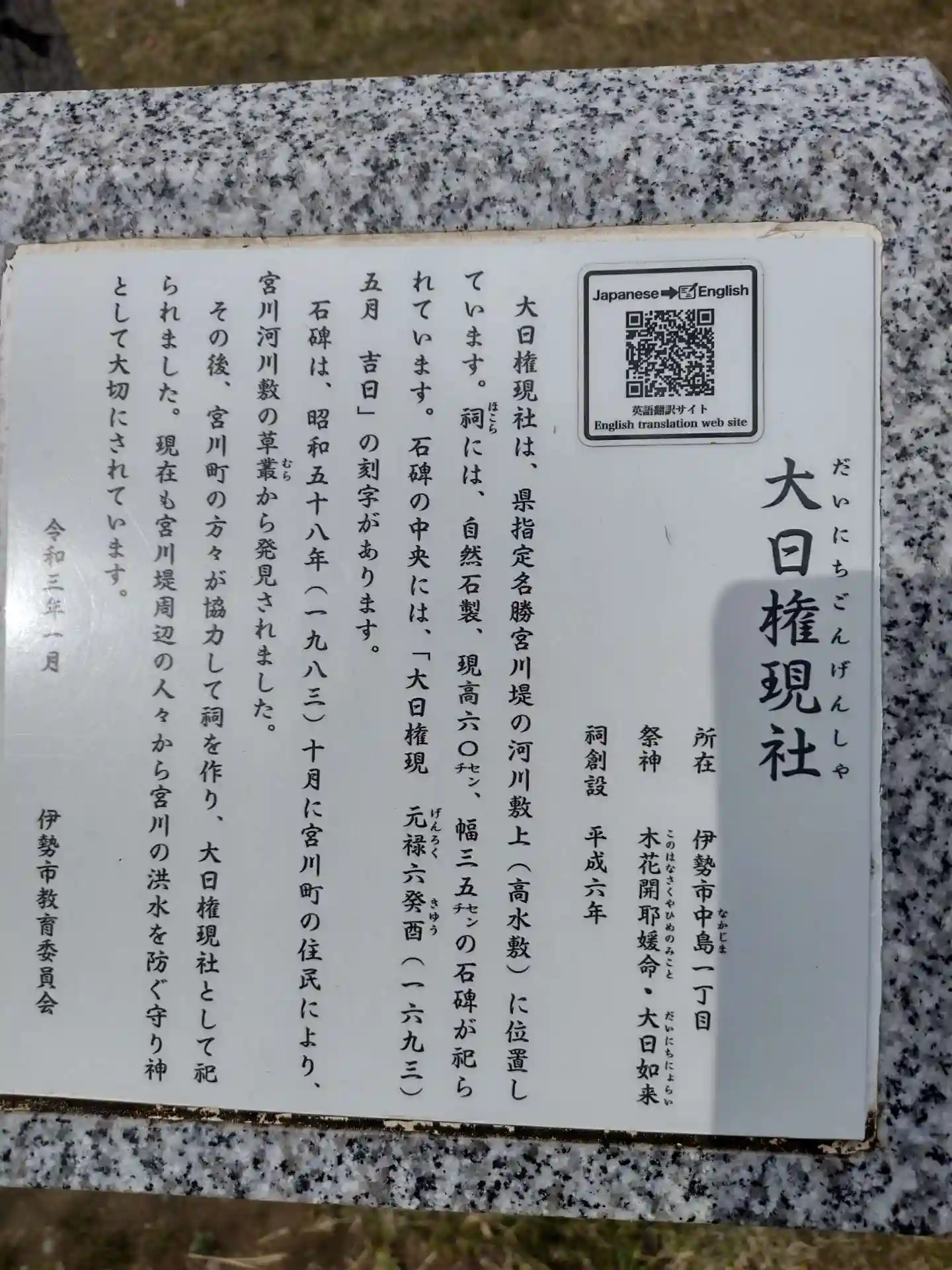 自然石製で高60センチ幅35センチの石碑が祀られていて、石碑の中央には、「大日権現 元禄6年癸酉(1693)5月吉日」の刻字があります。石碑は昭和58年(1983)10月に、宮川町の住民により宮川河川敷の草叢から発見されました。その後宮川町の人々が協力して、祠を作り、大日権現社として、祀られました。