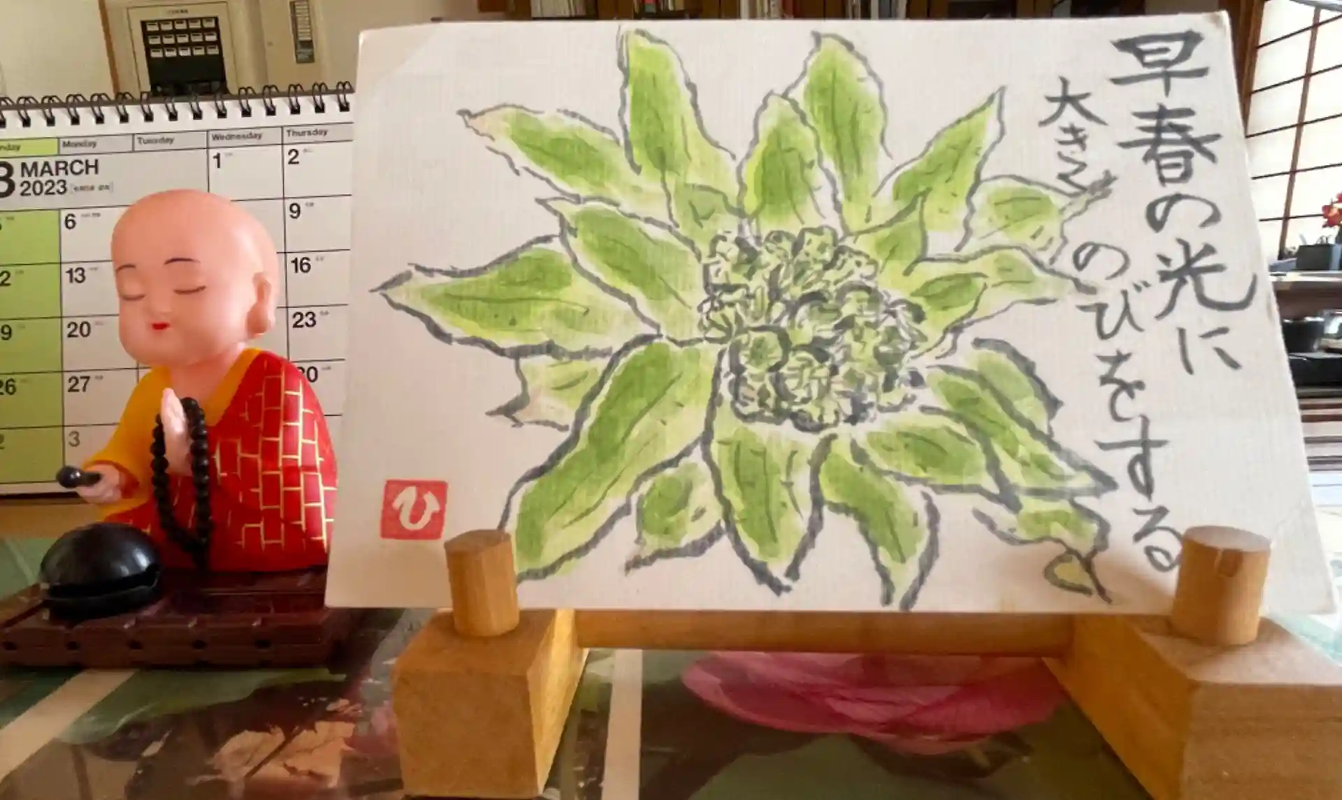 寺務所のカウンターに飾りました。来てくださった方々を迎えます。開いたふきのとうの絵に、しぜんとのびをしてしまいそう。ソーラーパワーで木魚を叩く可愛い和尚さんの姿にはつい微笑んでしまいます。