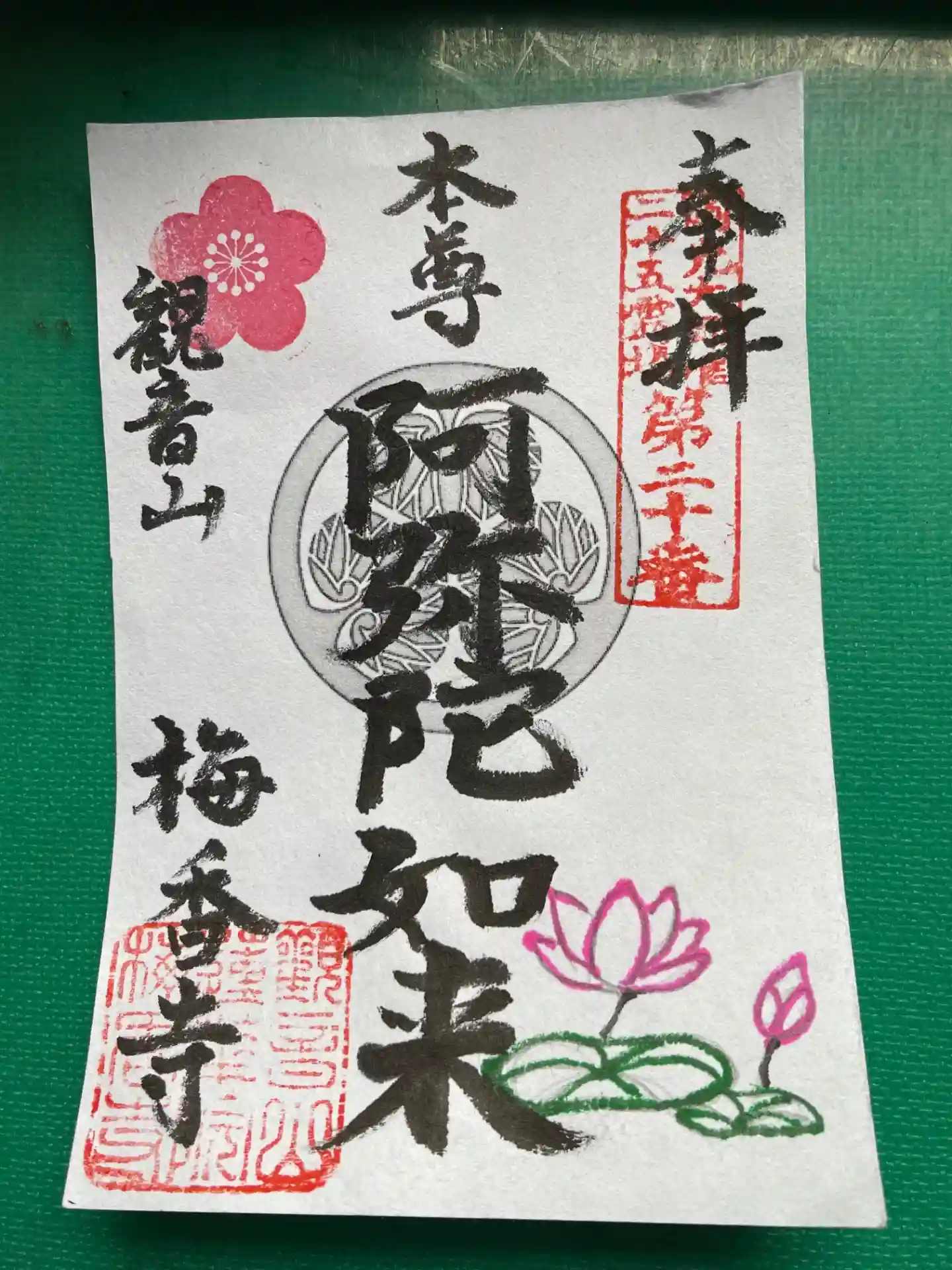 当寺の蓮池も、蓮の芽が出始めました。先日、根おこしをしたので、今年は開花も遅くなるかな?例年のごとく美しい大輪の紅蓮華が咲いて欲しい、そんな願いを込めて、御朱印には蓮の花を手描きしました。