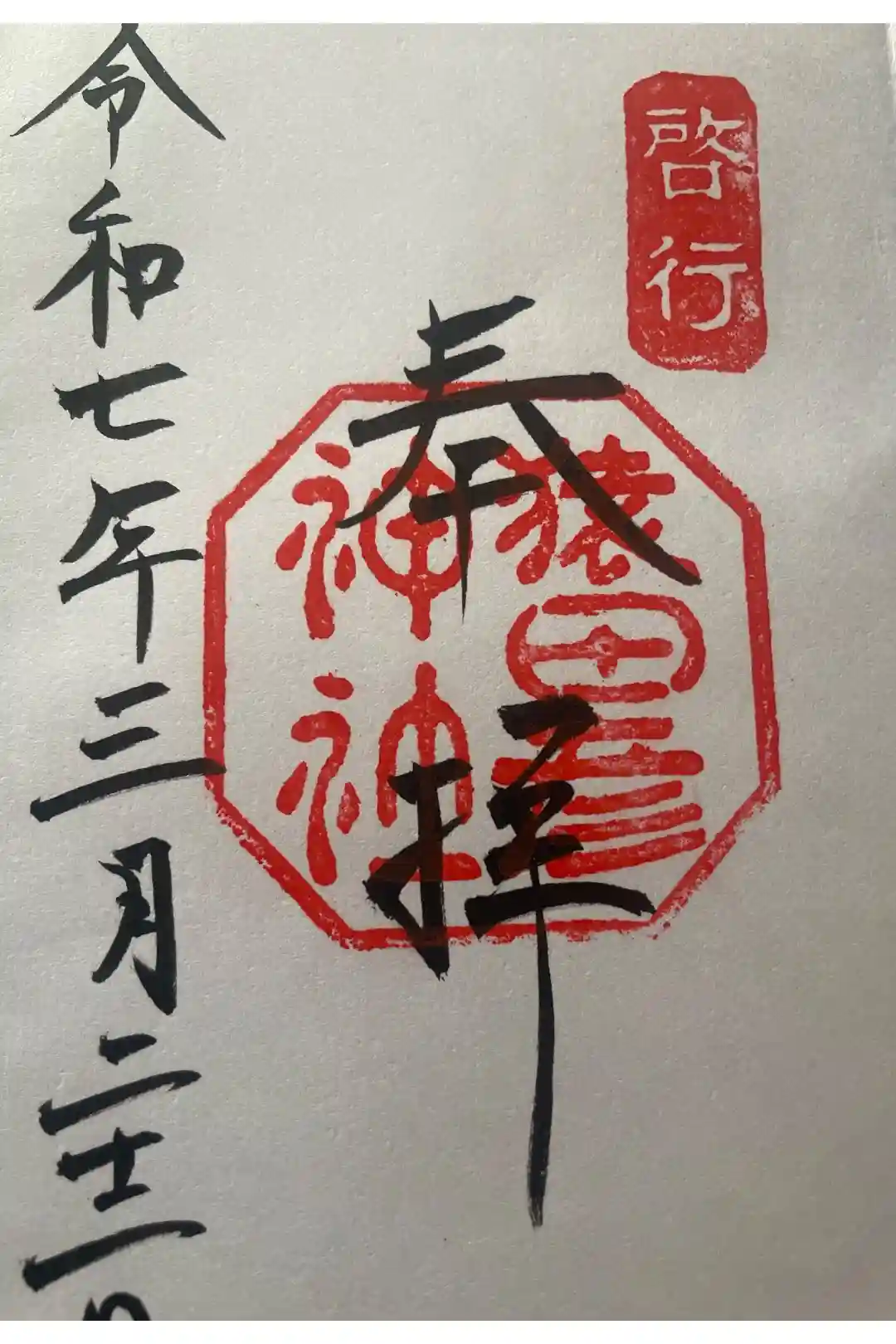 右から「啓行」の押印、真ん中に「奉拝」と大きく墨書きされ、その下に神社印が押されています。