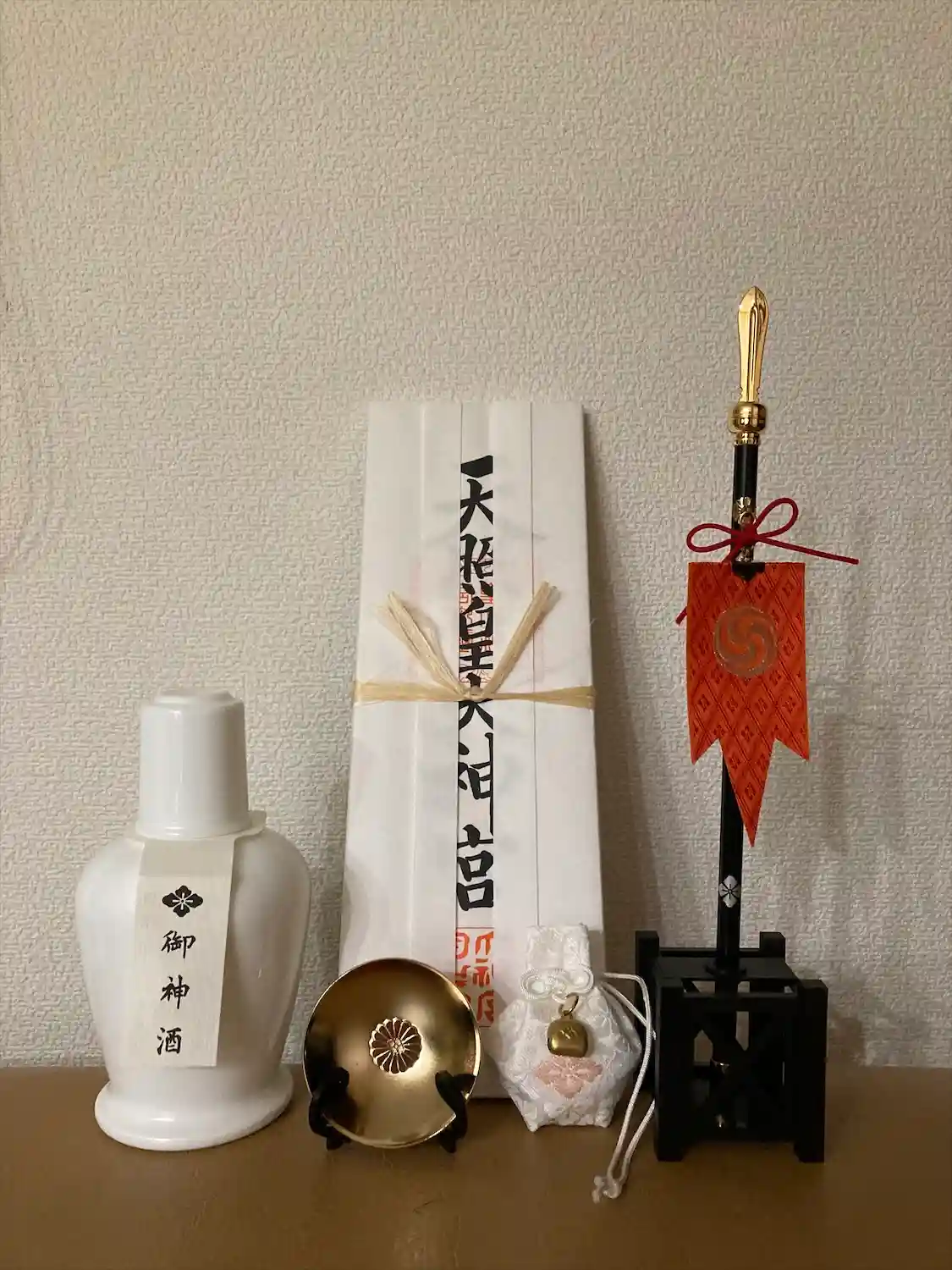 大角祓いとお守りと開運幸鉾、御神杯と御神酒を