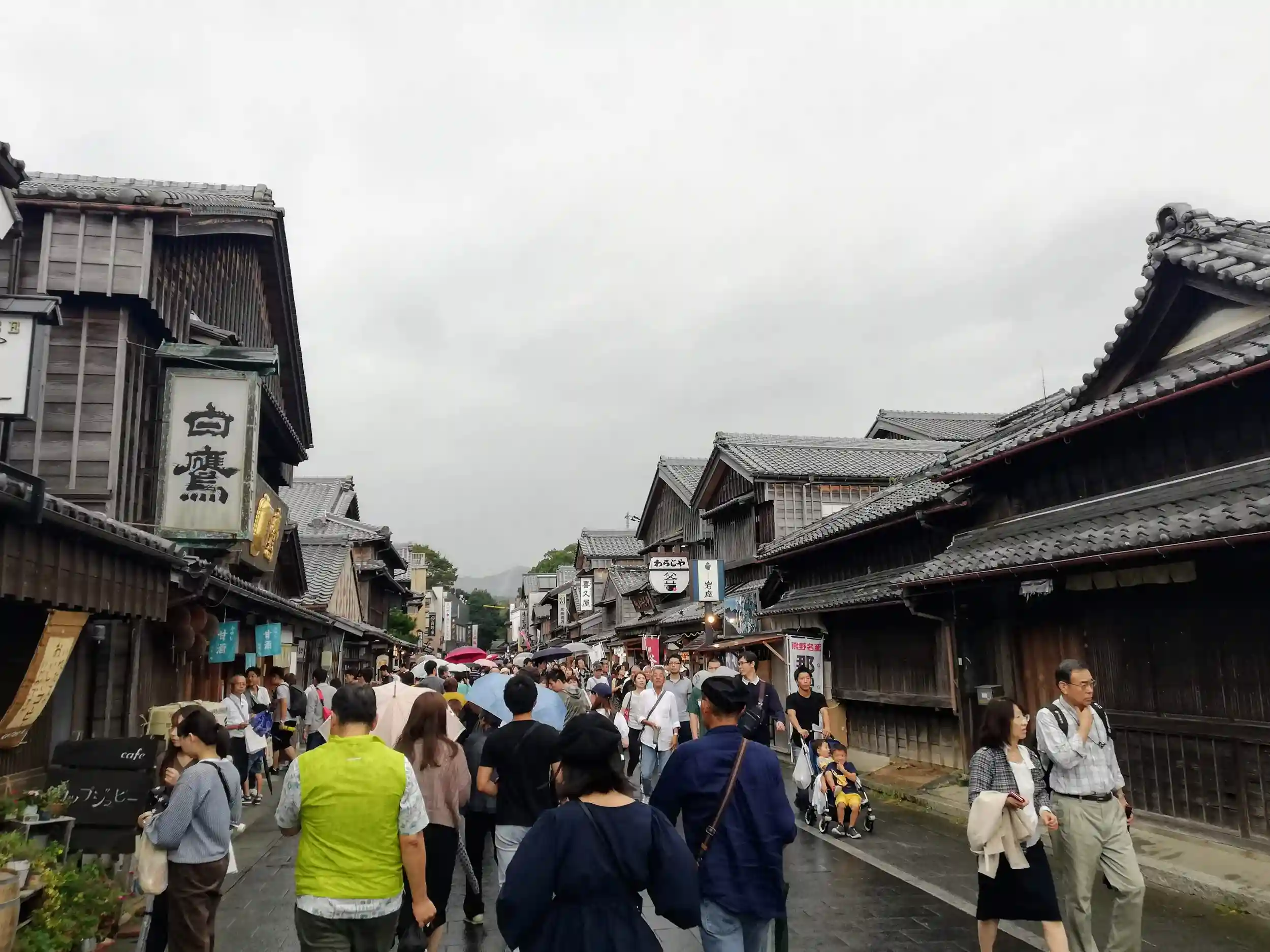 おはらい町。宇治橋から五十鈴川にそって古い町並みが続きます。土産店や飲食店であふれ観光客でにぎわっています。