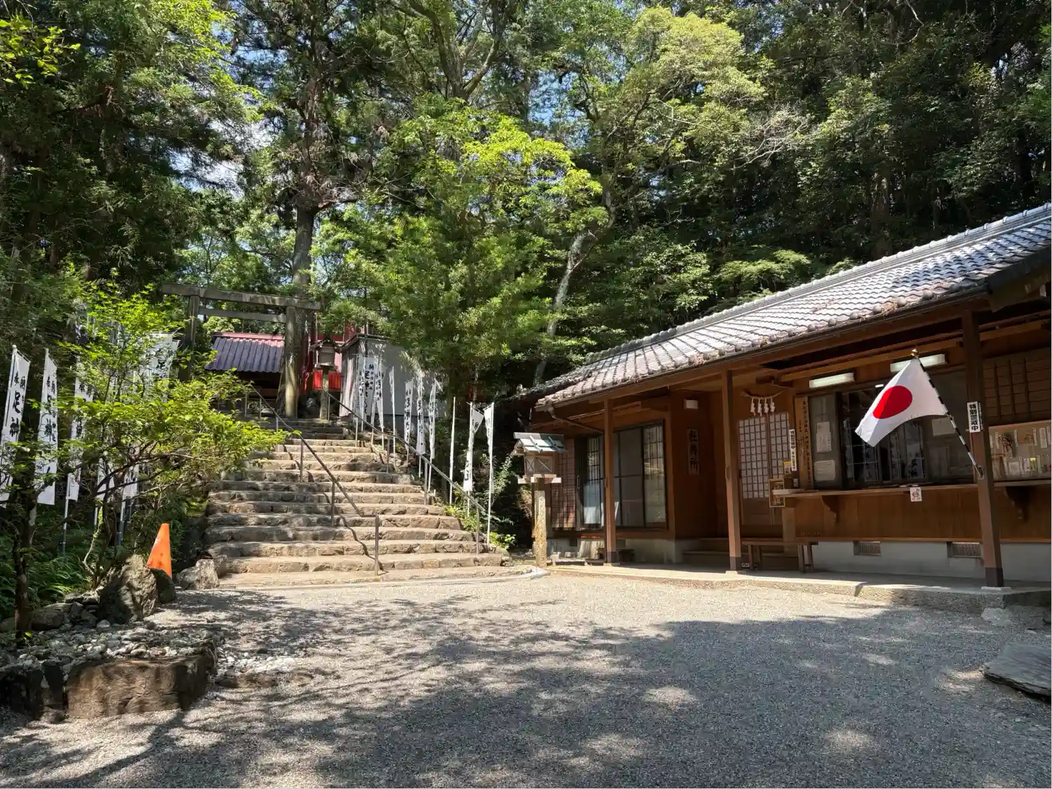右手に社務所 左手の階段登って拝殿・本殿や足神さんがいらっしゃいます