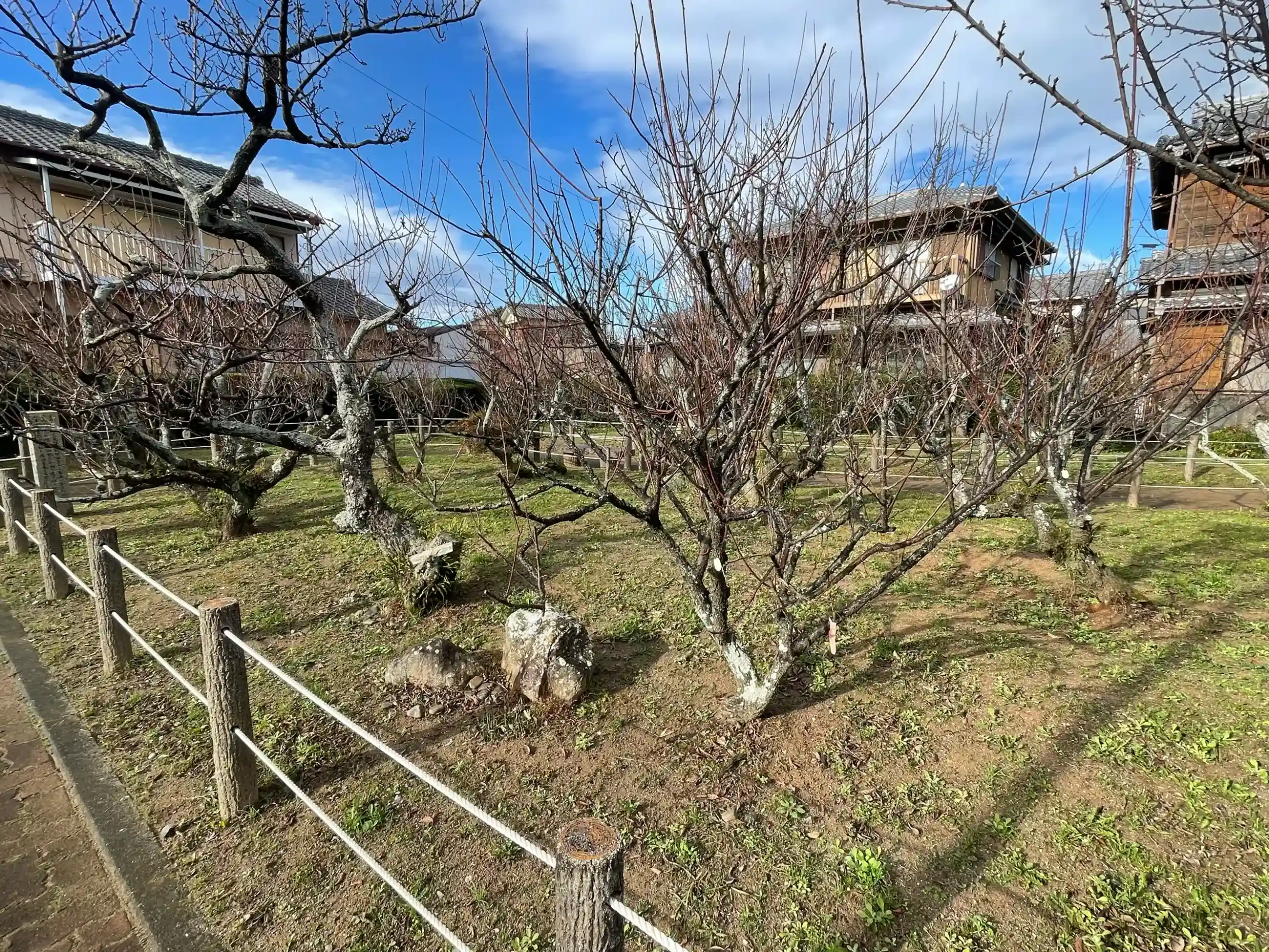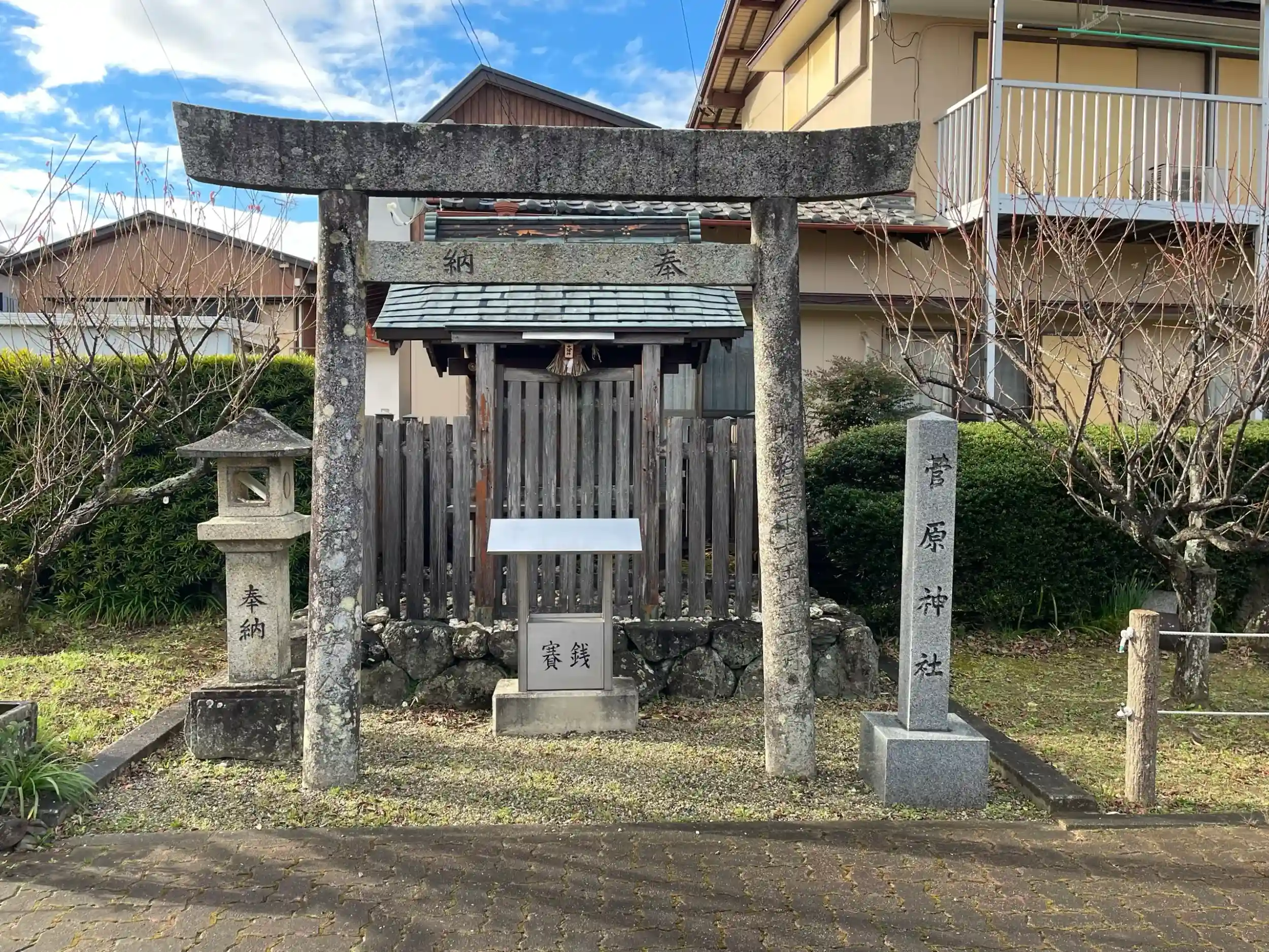 新開臥竜梅公園の中にある小さな神社です。臥竜梅は市の天然記念物に指定されている梅です。都で醍醐天皇の右大臣として仕えていた菅原道真公が、京左大臣藤原時平の中傷により、九州の大宰府に左遷されました。家来の今村刑部師親に、このまま朽ちてしまったら、身に負う冤罪をすすぐことすら出来ないと、崇敬されていた伊勢神宮に代参させて、日ごろ賞愛の梅を伊勢の地に奉納植樹させ冤罪の晴れるのを祈願しました。その梅がこの臥龍梅で有り、「此の梅は成長し、日本無双の名木と成る」と申されたという伝承が残されています。