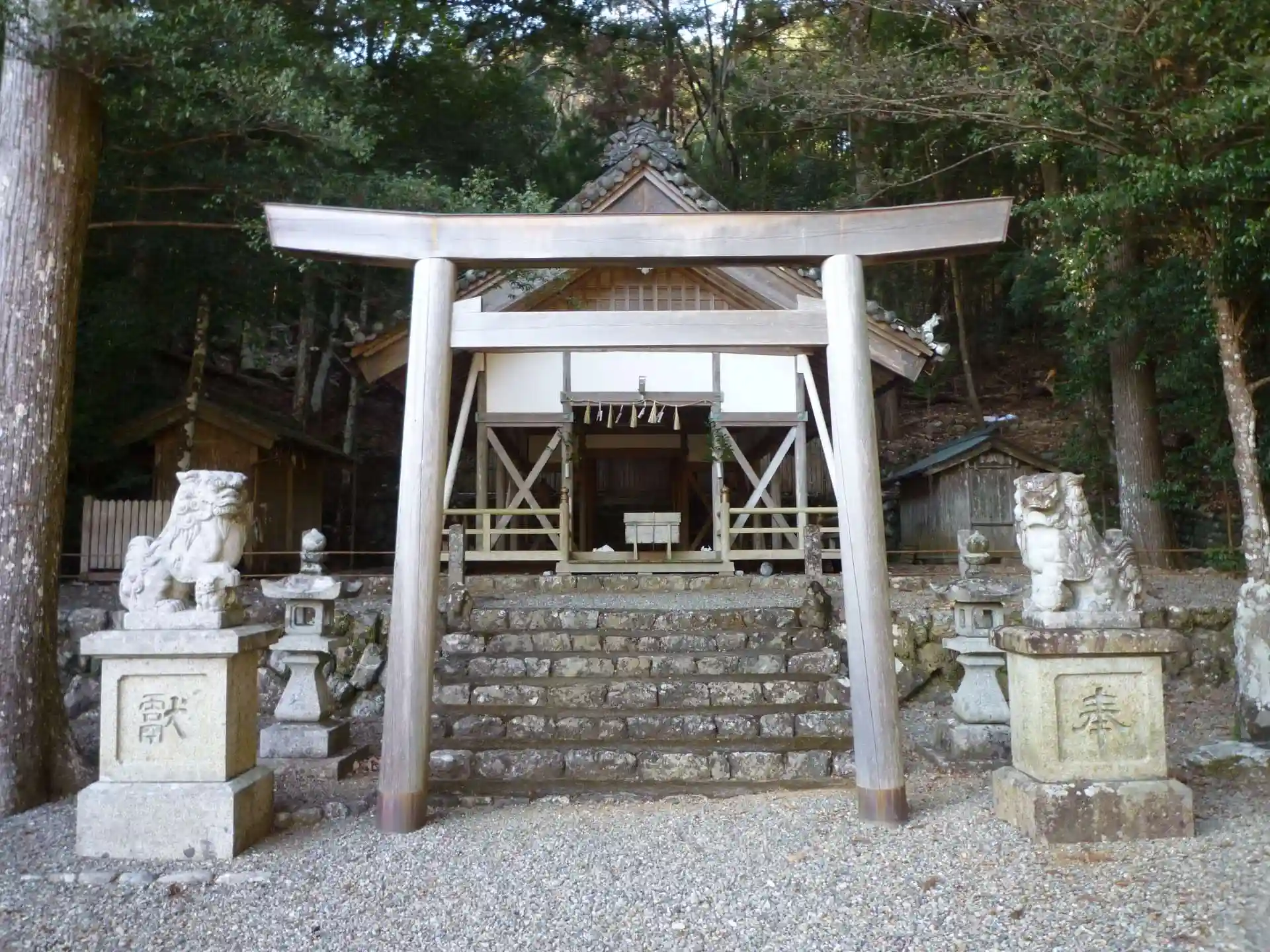 県道22号線を南島方面に進み、JAショップを過ぎて信号を右折すると正面に鳥居が見えてきます。鳥居の左手に駐車場があり、修復されていますが自然石で作られた常夜灯が特徴的でした。