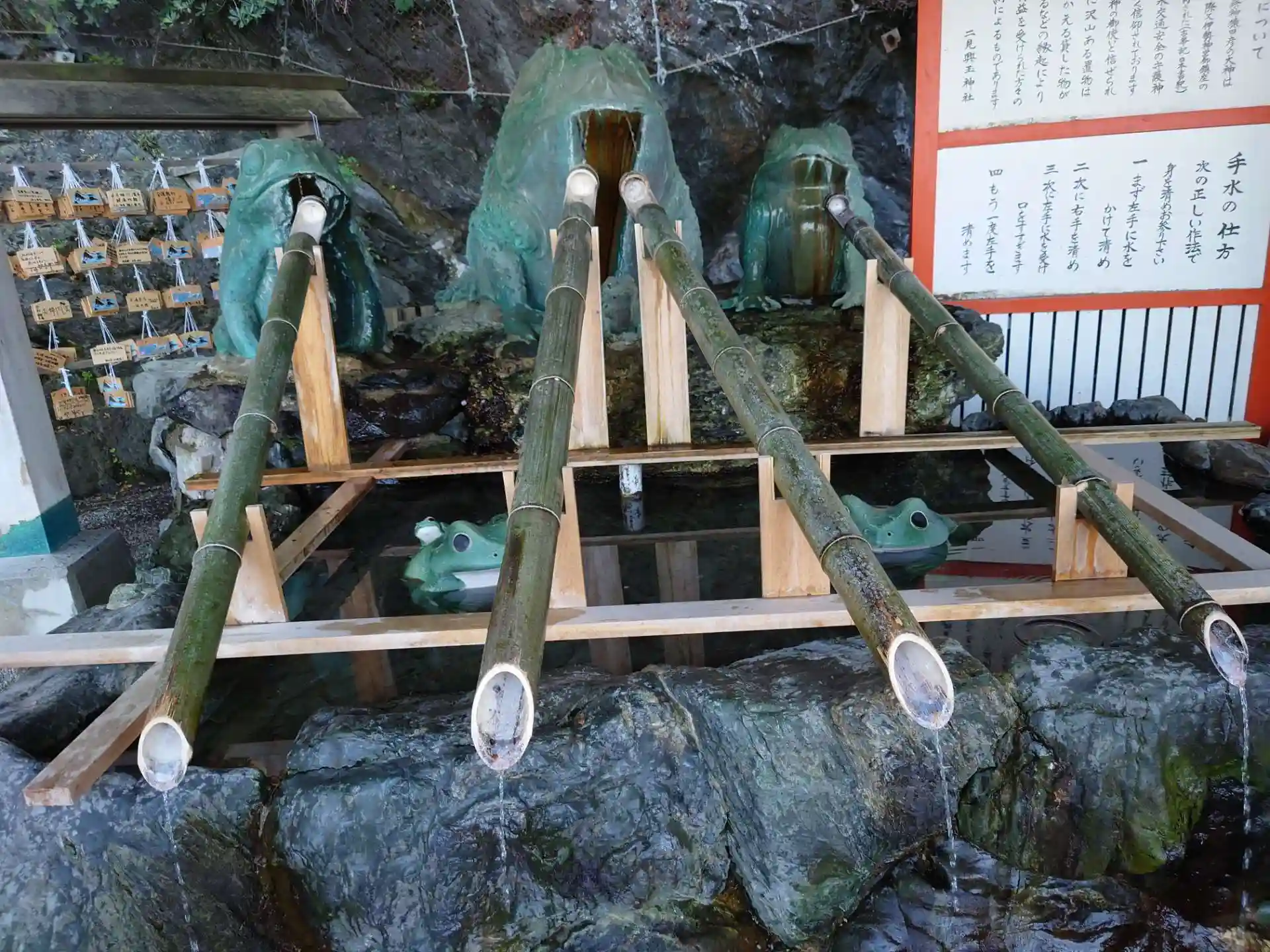水の中には願掛け蛙、向かって右の蛙には男性が、左の蛙には女性が水てかけて御神恩を戴く