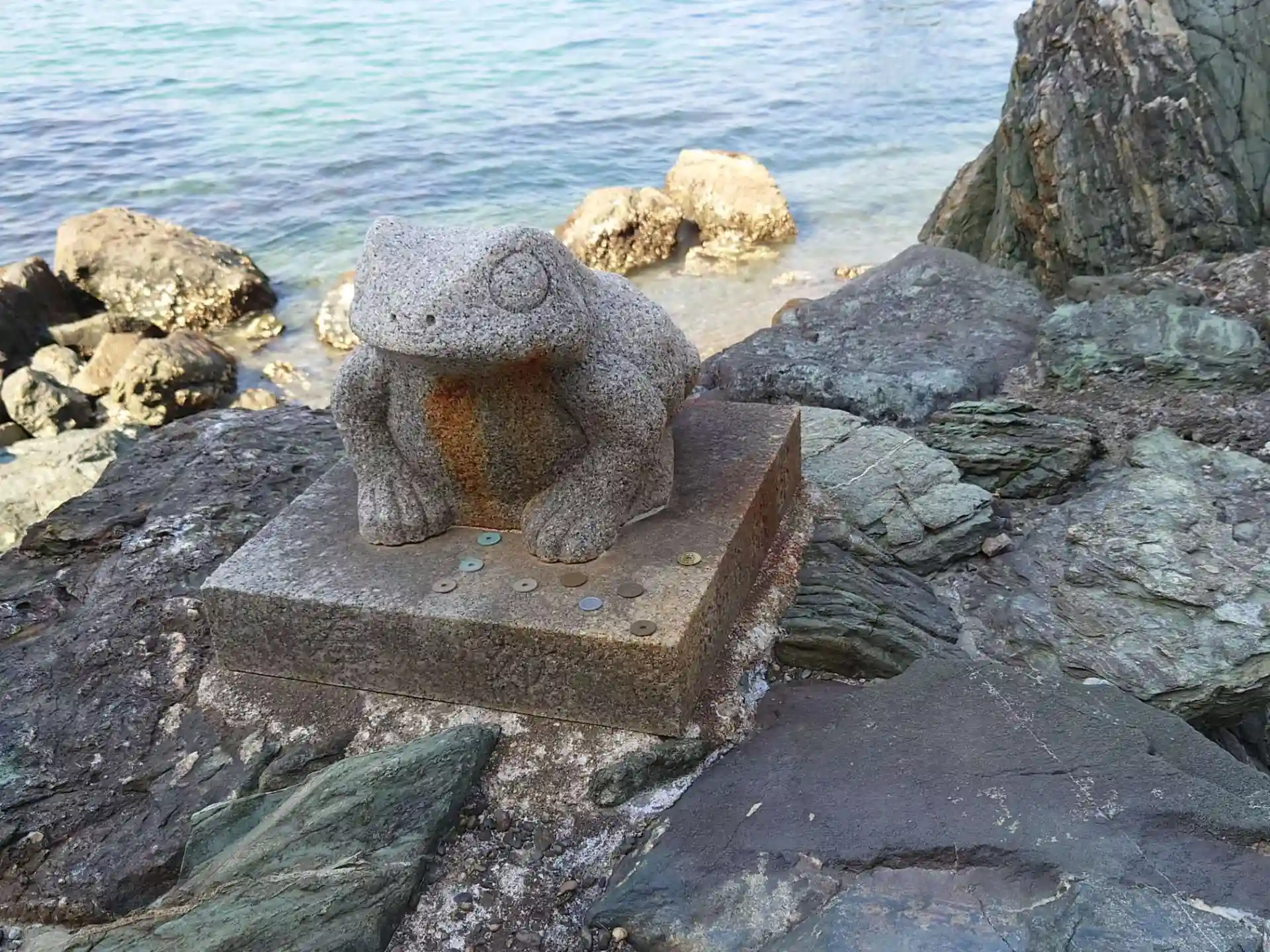 お伊勢参り⑩伊勢の中心から約8キロ、自転車を漕いで行きました。本来は神宮をお参りする前にこちらで身を清めるのが順序なのですが、スケジュールの都合で最後となりました。今回の伊勢参りは自転車を選択することによって予定より1時間ほど短縮出来ました。バスや車だとこうはいかないと思います。ただ伊勢よりこちらまでの道のりは何も遮るものはなく風が強いと結構しんどいかも。ようやく門前町らしい景観になって、参道には海沿いは松、反対側には老舗旅館が建ち並んでいました。一の鳥居を過ぎると海岸沿いの一本道の参道。あちらこちらに蛙の置物。写真でしか見たことのなかった夫婦岩も観る場所で姿を変え、参拝の途中ちょくちょく見ながら楽しみました。社務所で書き置きの御朱印を戴き、更に先の境内社の龍宮社へ向かいました。