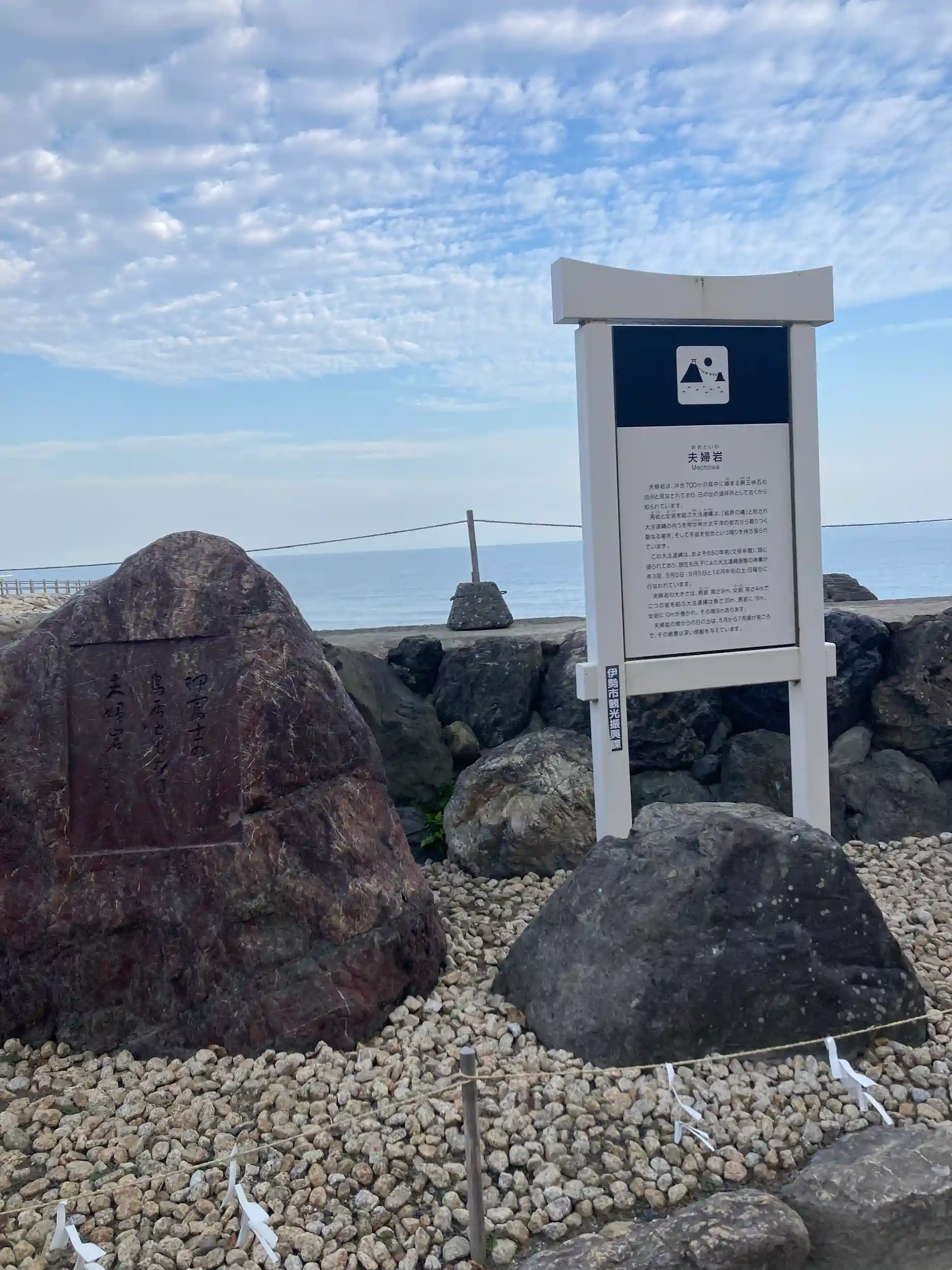 日の出の時間には間に合いませんでしたが、快晴の青い空と海に浮かぶ夫婦岩は綺麗に映えてました。