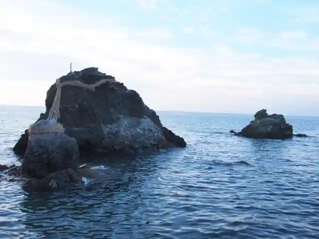 参道は海岸沿いの石の道で、狭くて少し険しいところです。境内のカエル石像も多く、面白くて、縁起もとてもいいです。夫婦岩がありますので、縁結び、夫婦円満は御利益ですね。カエルは多産の象徴です。