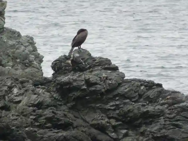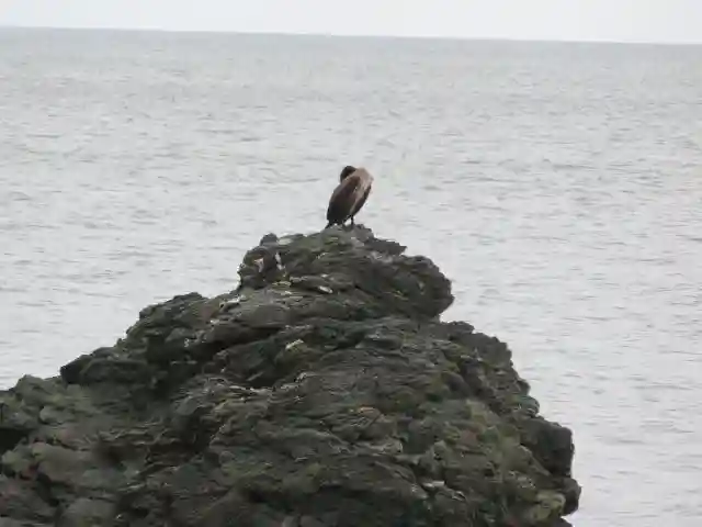 烏帽子岩と鳥。近年、波の浸食で烏帽子岩改めカエル岩だそうです。