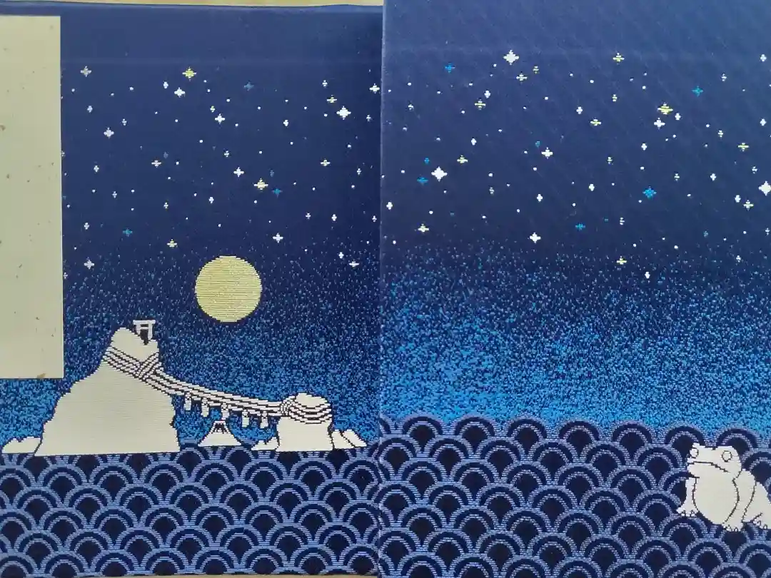 満月は金色で、夫婦岩と御神使のかえるは白色で描かれています。