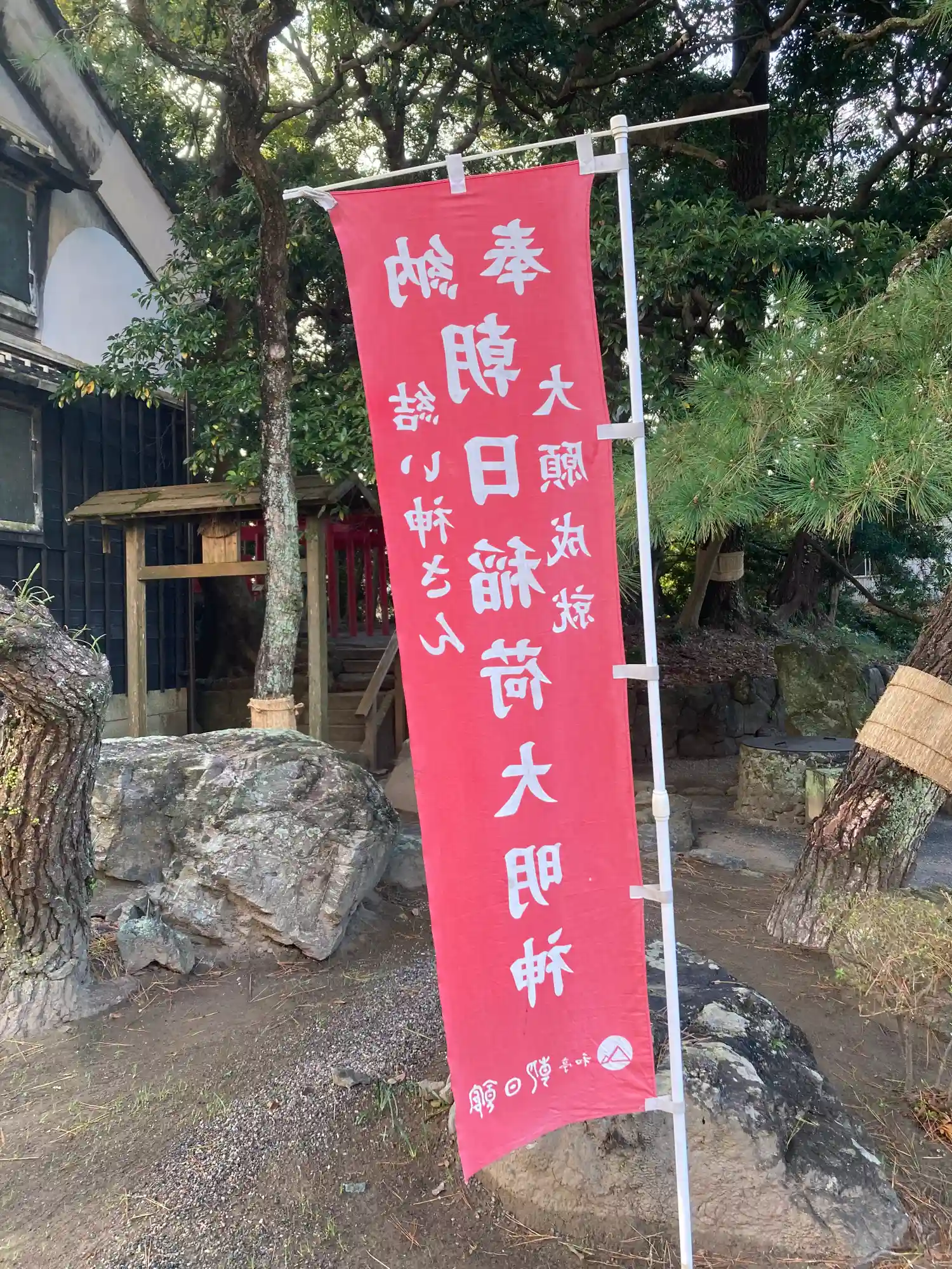 のぼりを見ますと「朝日館」とあり、神社の向か…