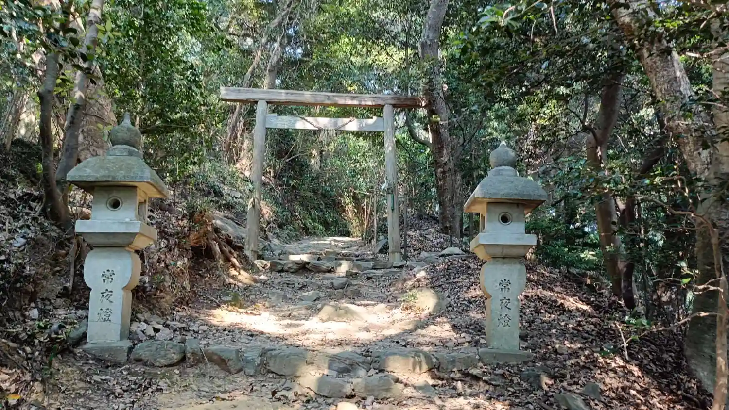 あまり高低差のない山道を250m進むと山道が途切れ、そこに鳥居と<海上守護神 領有神(宇志波那流神)>がある。