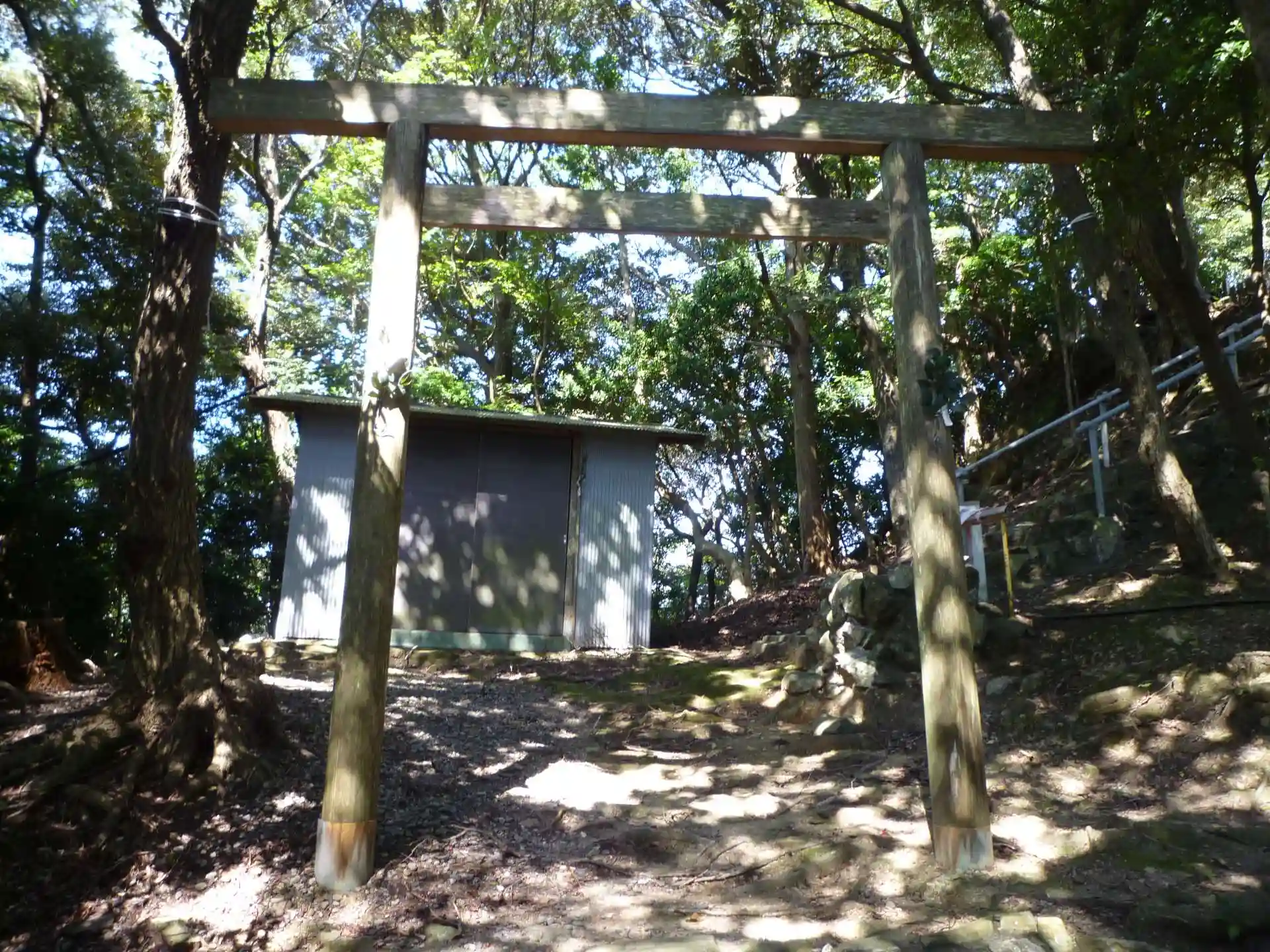 湯快リゾート伊勢志摩 鳥羽彩朝楽の敷地内に鎮座されています。参道入口には二基の常夜燈と八幡神社と書かれた案内があり、階段と山道を登ると拝殿が見えてきます。小さな本殿と両脇に祠が並んでいます。