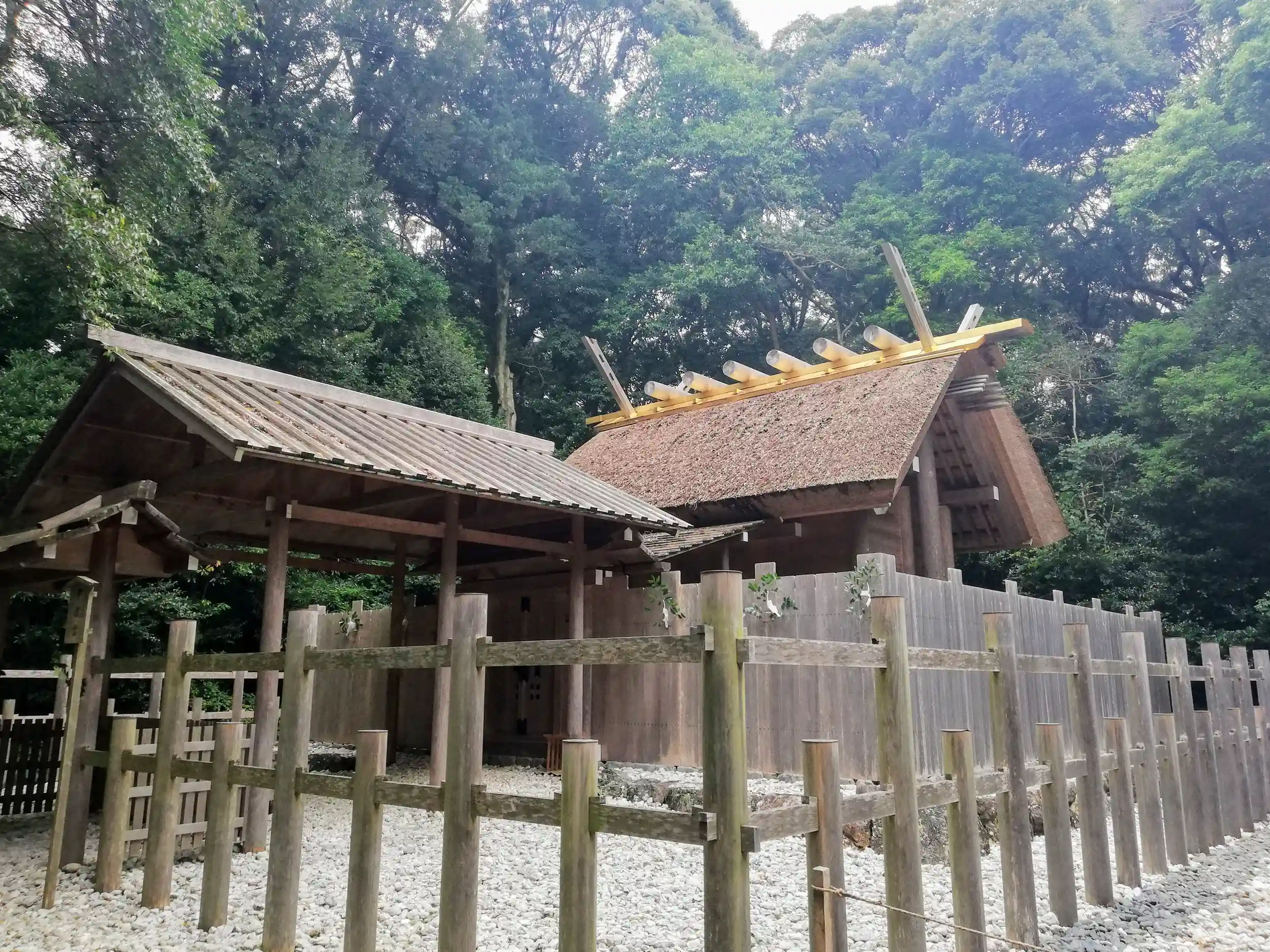 社殿。本殿は内削ぎの千木と偶数本の鰹木がのっており、皇大神宮の様式にのっとっていることがわかります。