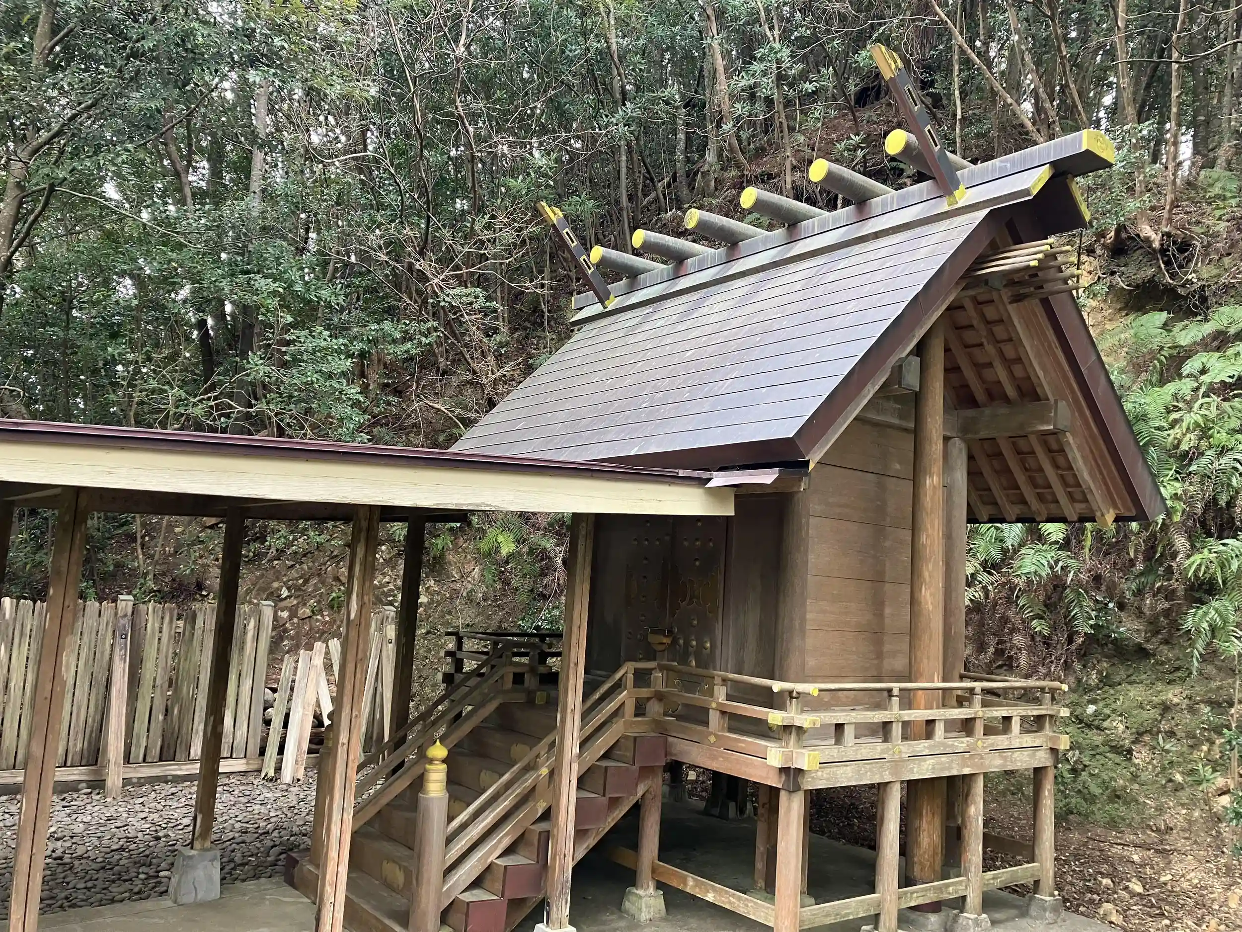 本殿を囲っている木の柵が、イノシシか何かによって破壊されていました。