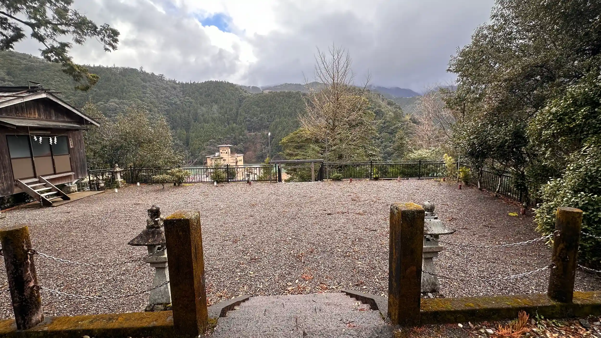 十津川温泉バスターミナルより徒歩での参拝となります、民家の細い間に参道があり見逃しやすいです、階段を登ると鳥居がありさらに階段を上がると境内です、御祭神は分かりません、社務所も無人で聞くこともできませんでしたが、立派な社殿です。境内からは温泉宿、小学校、十津川も見下ろせます。