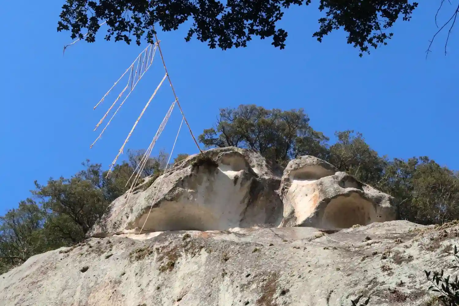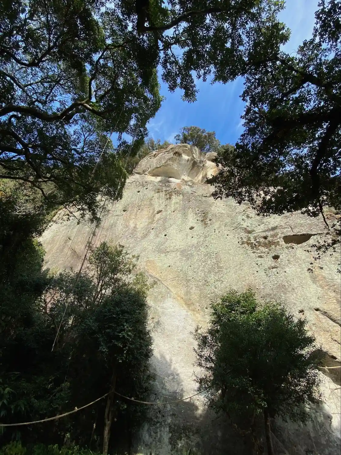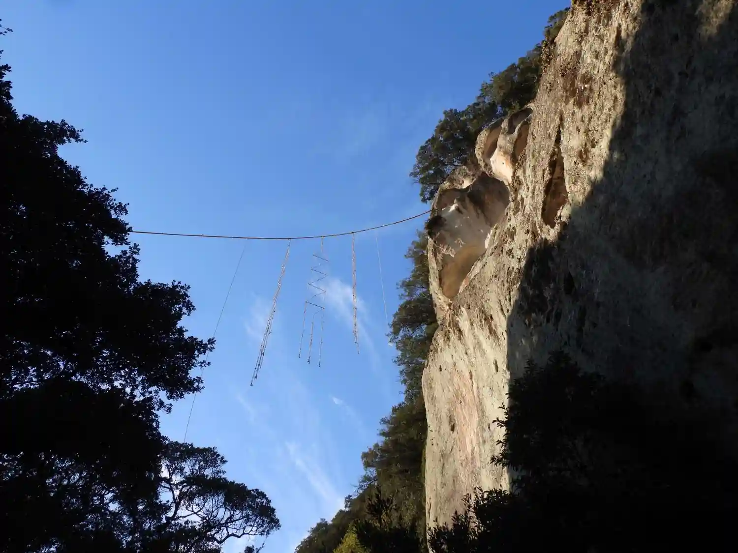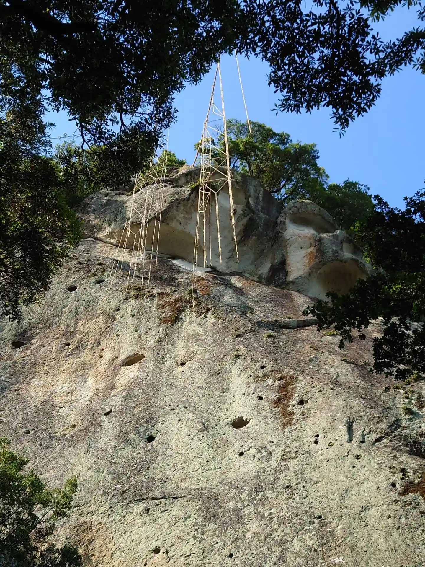 岩の上の方に綱が張ってあります。