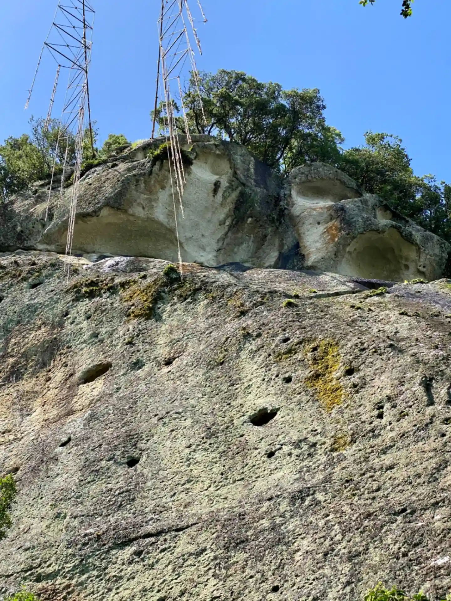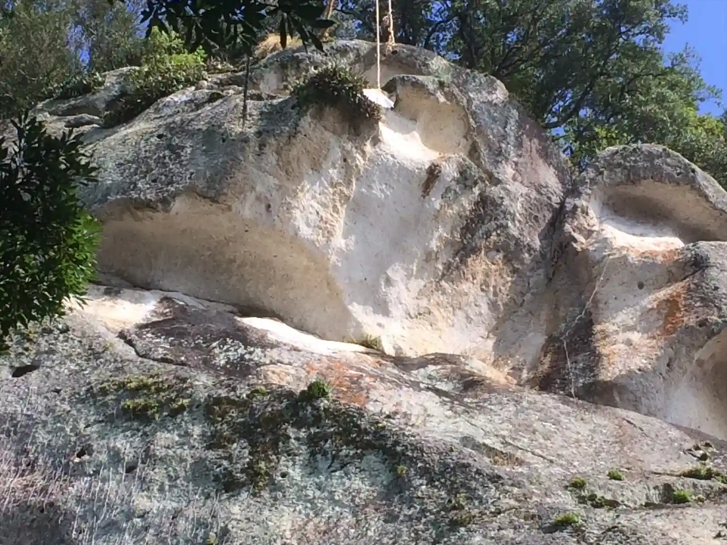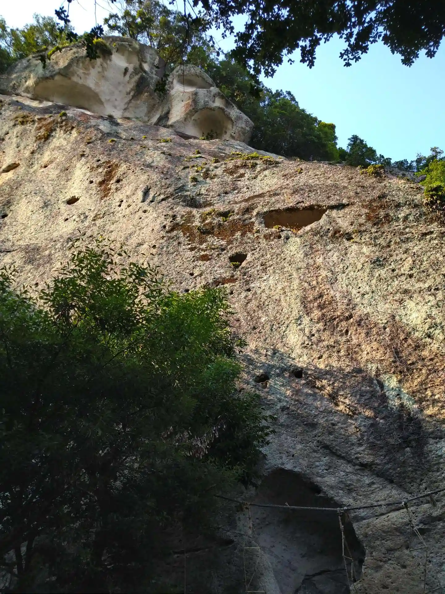 岩の上の方に綱が張ってあります。