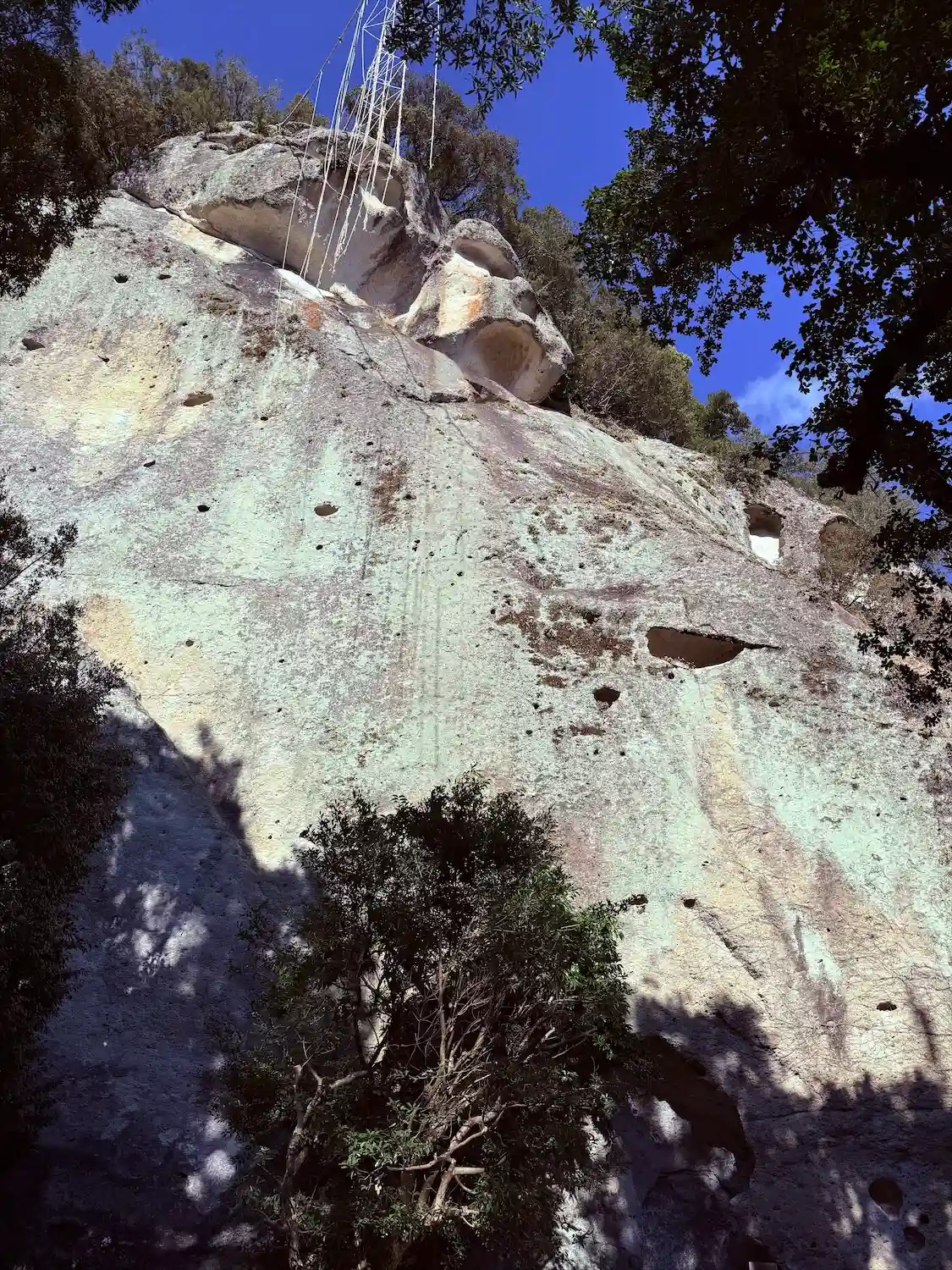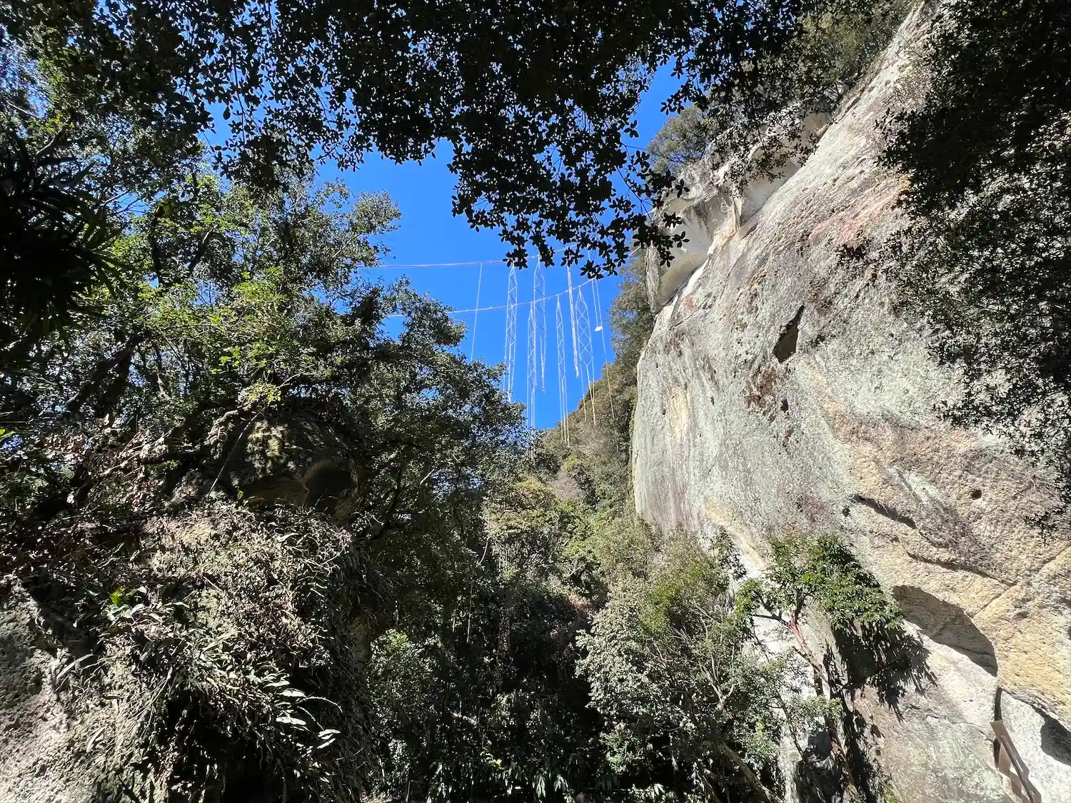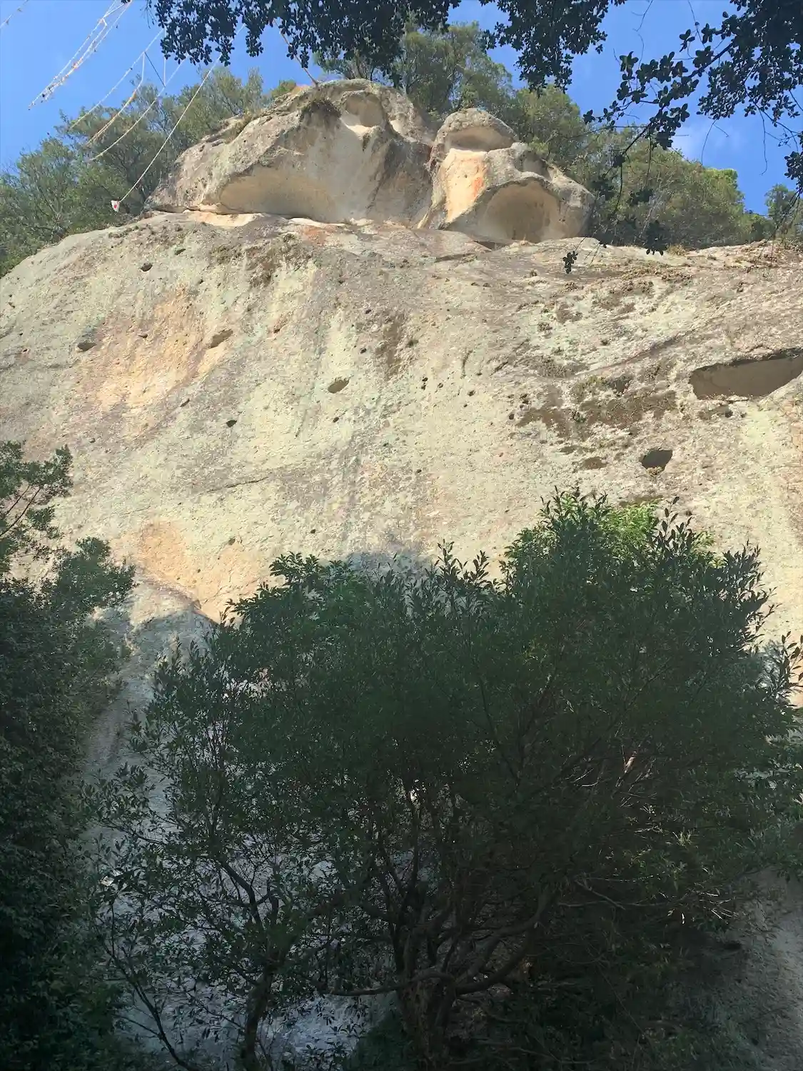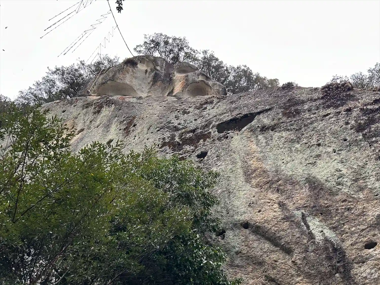 岩の上の方に綱が張ってあります。