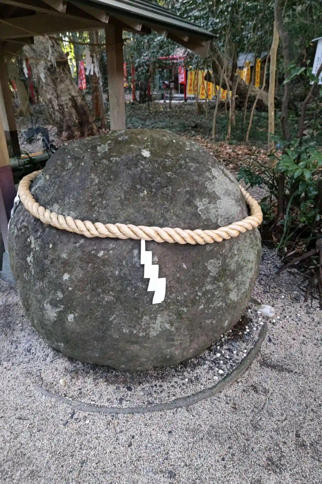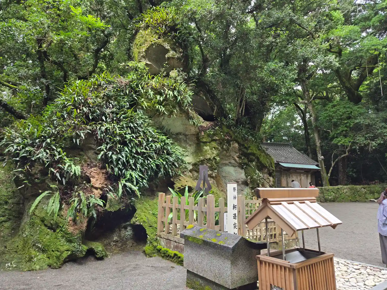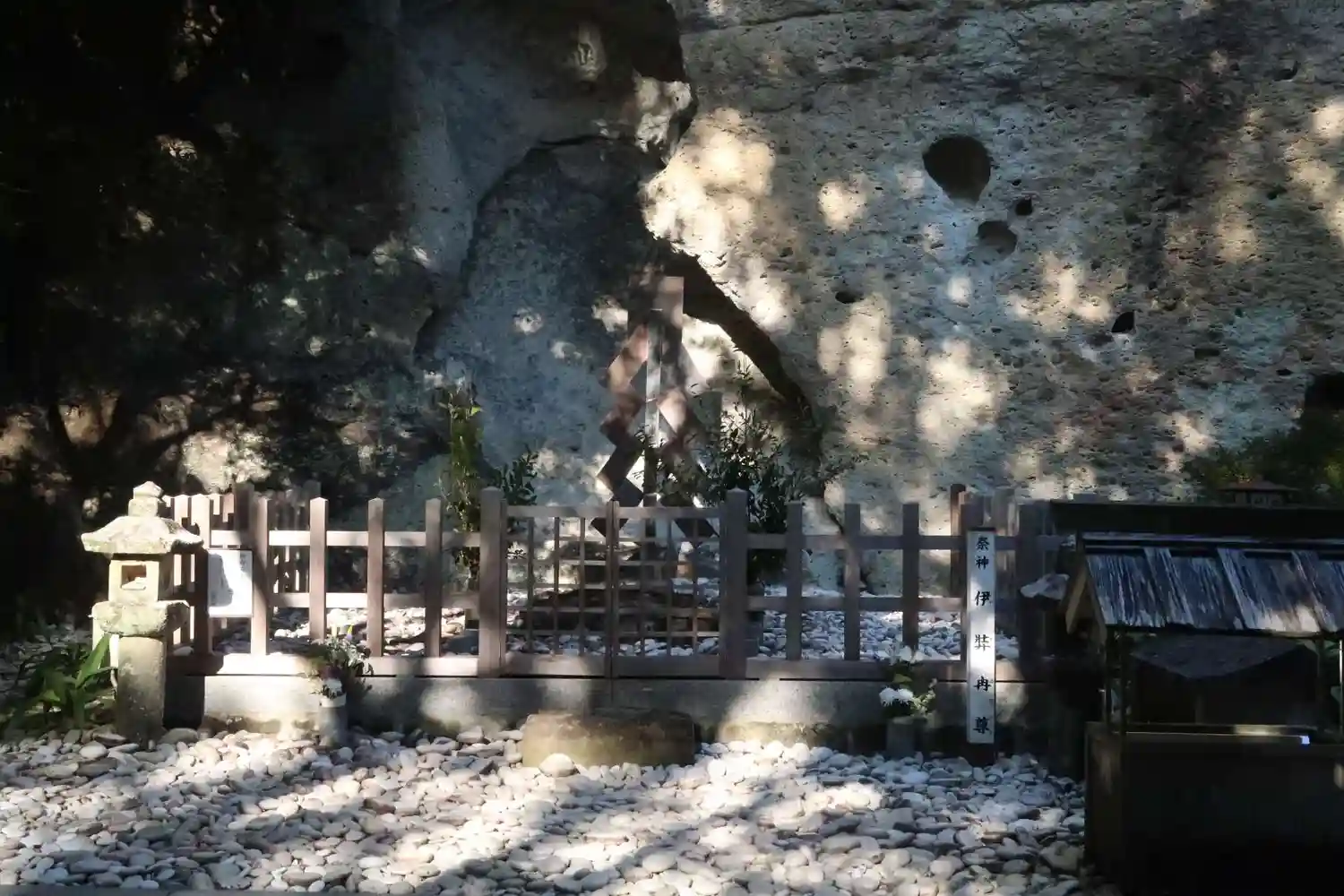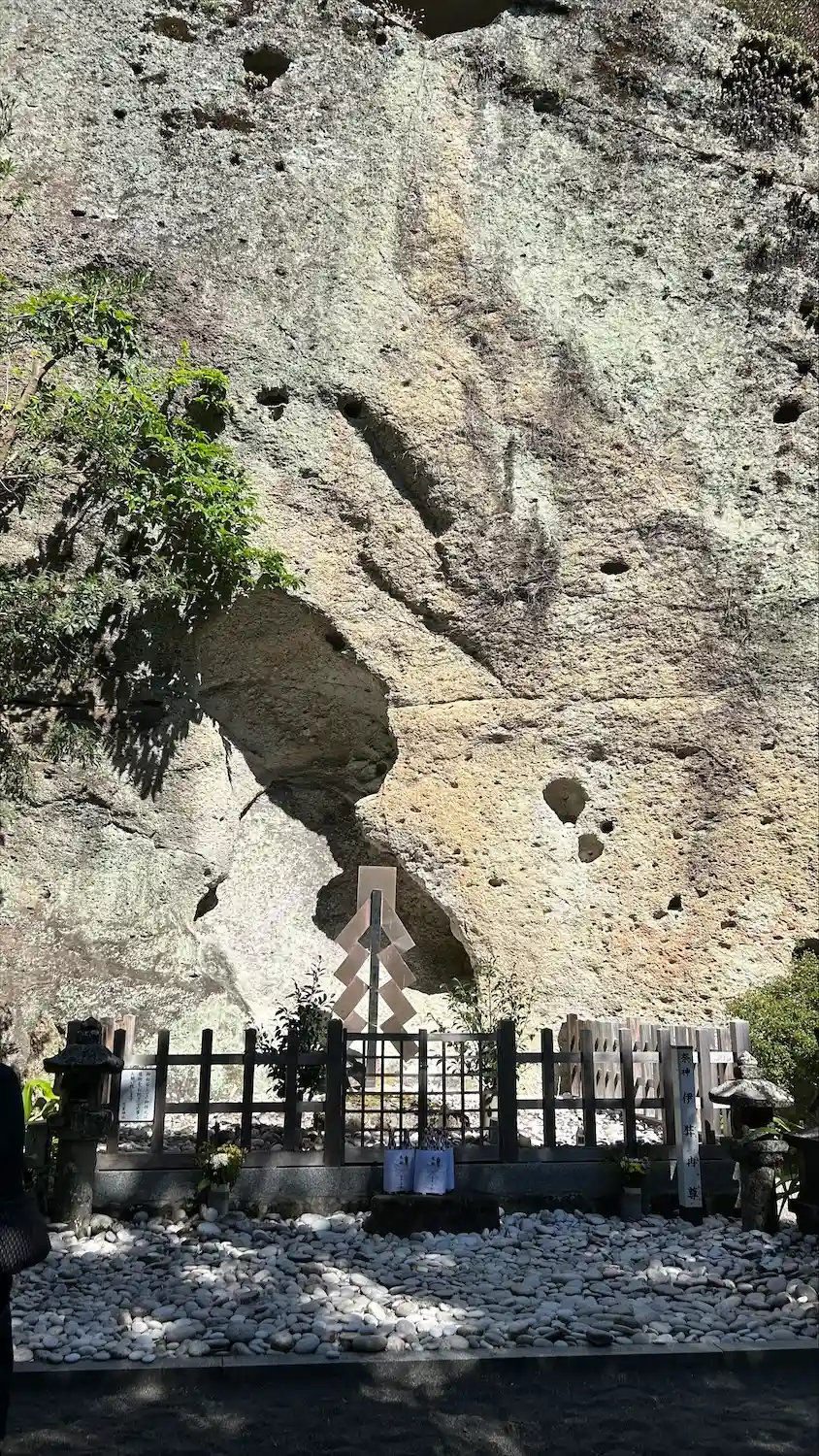 後ろにはご神体の岩がそびえています。