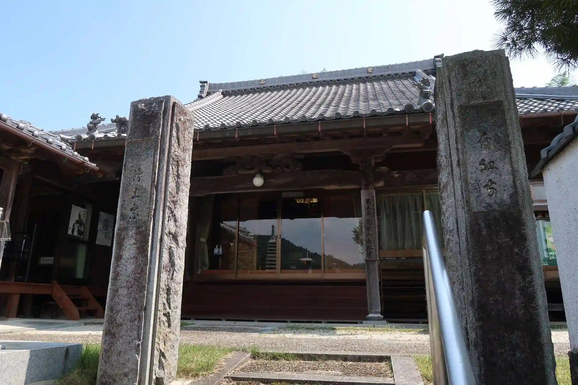 寺院前に広い駐車場がありましたので停めさせて頂きました。山門は石柱タイプで、正面に本堂で、左側に薬師堂です。