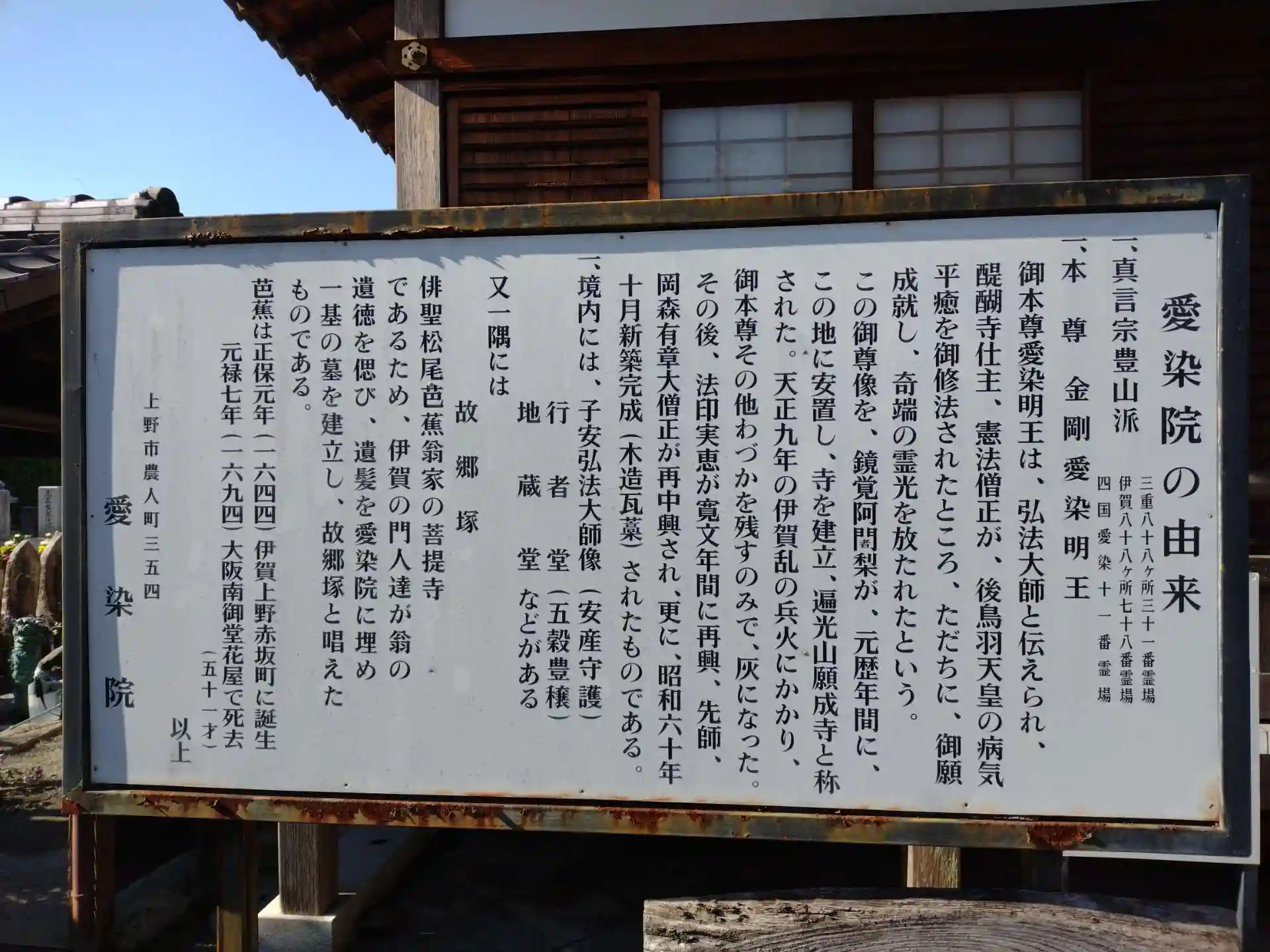 松尾家の菩提寺で、愛染明王を安置することから愛染院の名で知られているようです、境内に芭蕉翁の遺髪を納めた故郷塚があります。