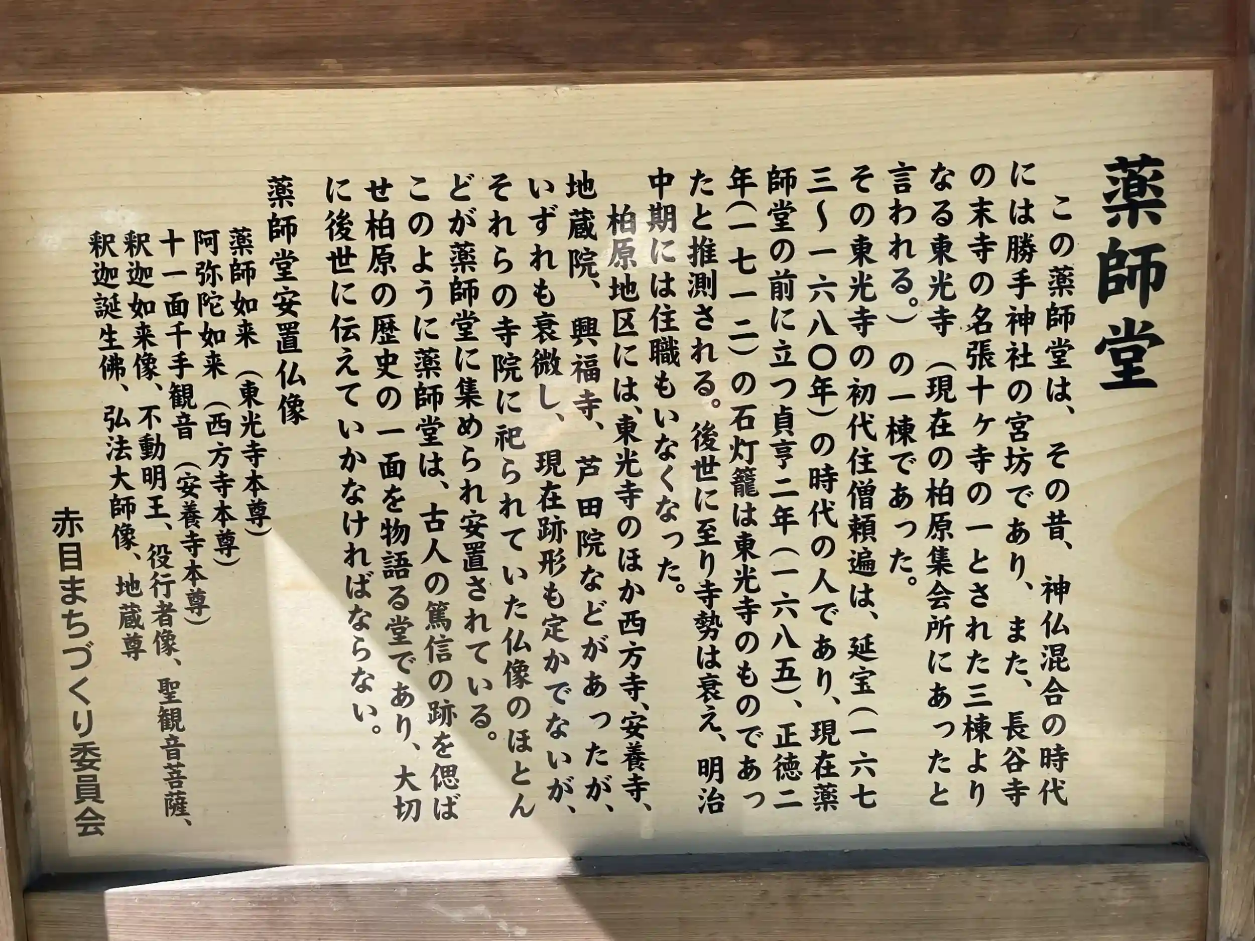 薬師堂の前に立つ貞享2年(1685)、正徳2年(1712)の石灯籠は東光寺のものであったと言われています。柏原地区には、東光寺のほか西方寺、安養寺、地蔵院、興福寺、芦田院などがありましたが、いずれも衰微し、それらの寺院に祀られていた仏像のほとんどが薬師堂に集められ安置されています。