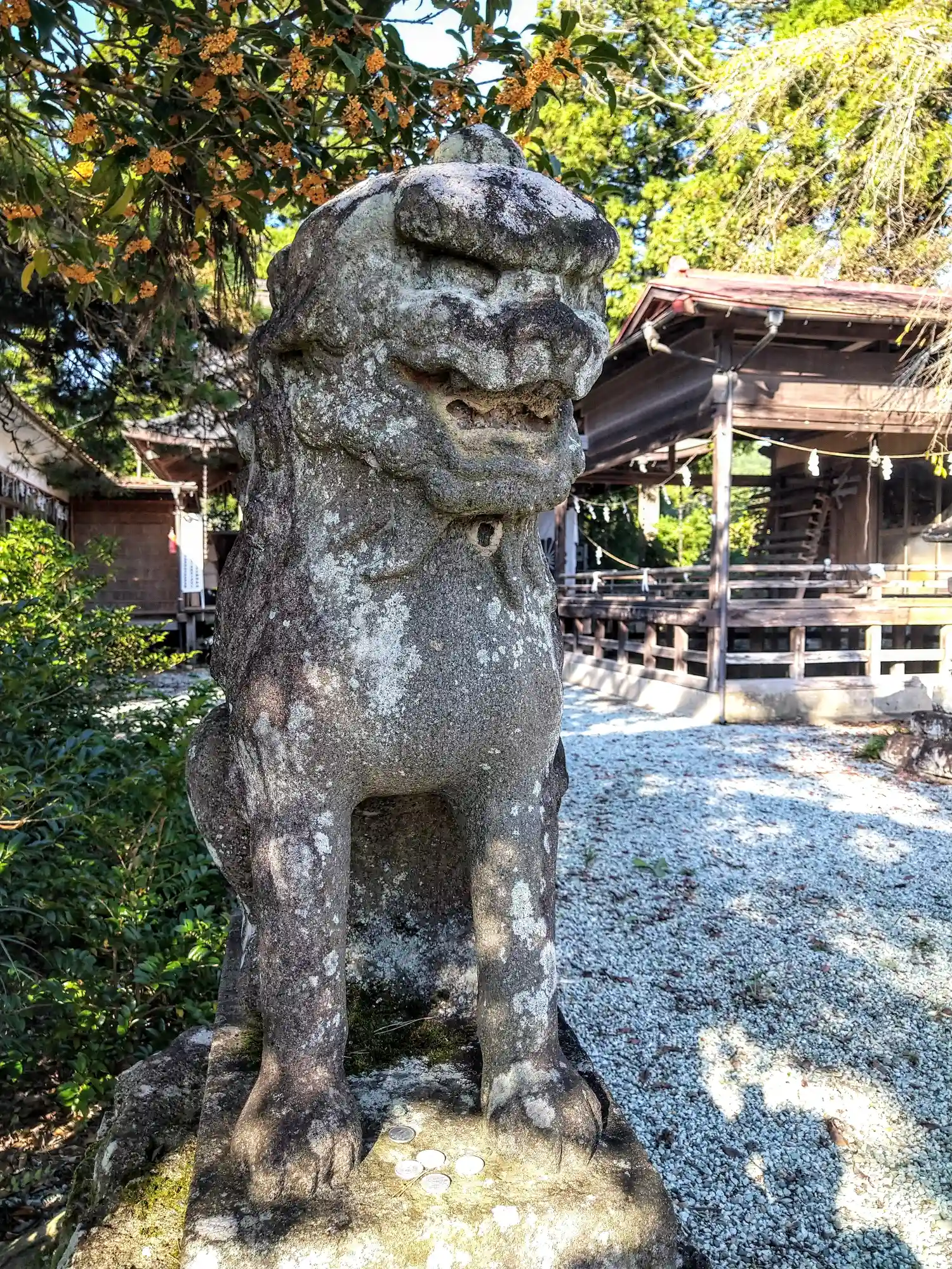 生出森八幡神社(里宮)参道正面右側に(吽形の狛犬さんの様子です