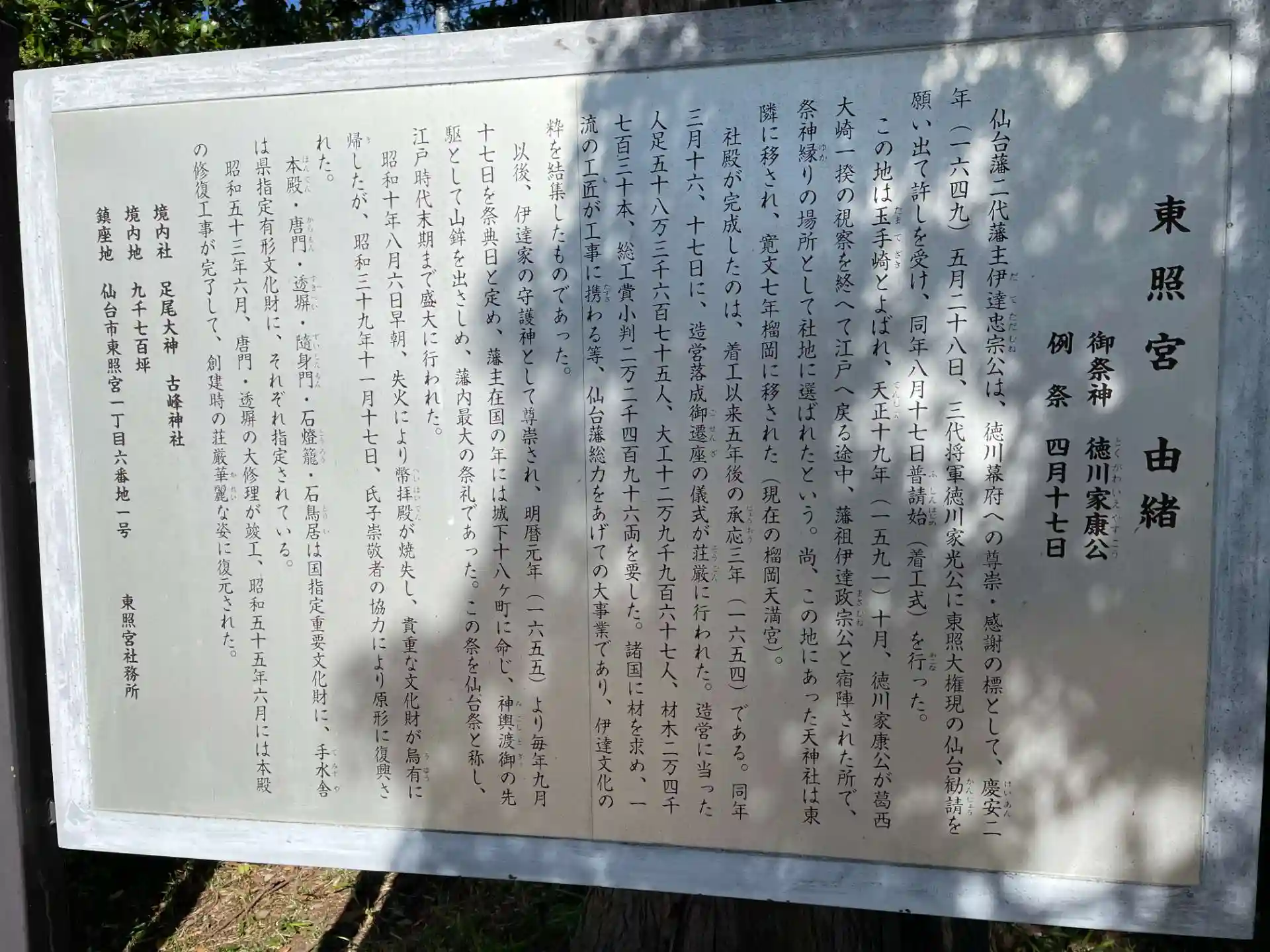 御神体は 東北最大ともいわれる御神輿に乗せて 江戸から仙台まで7日架けて渡御し のちの東照宮御祭礼(仙台祭)の起源となっている。