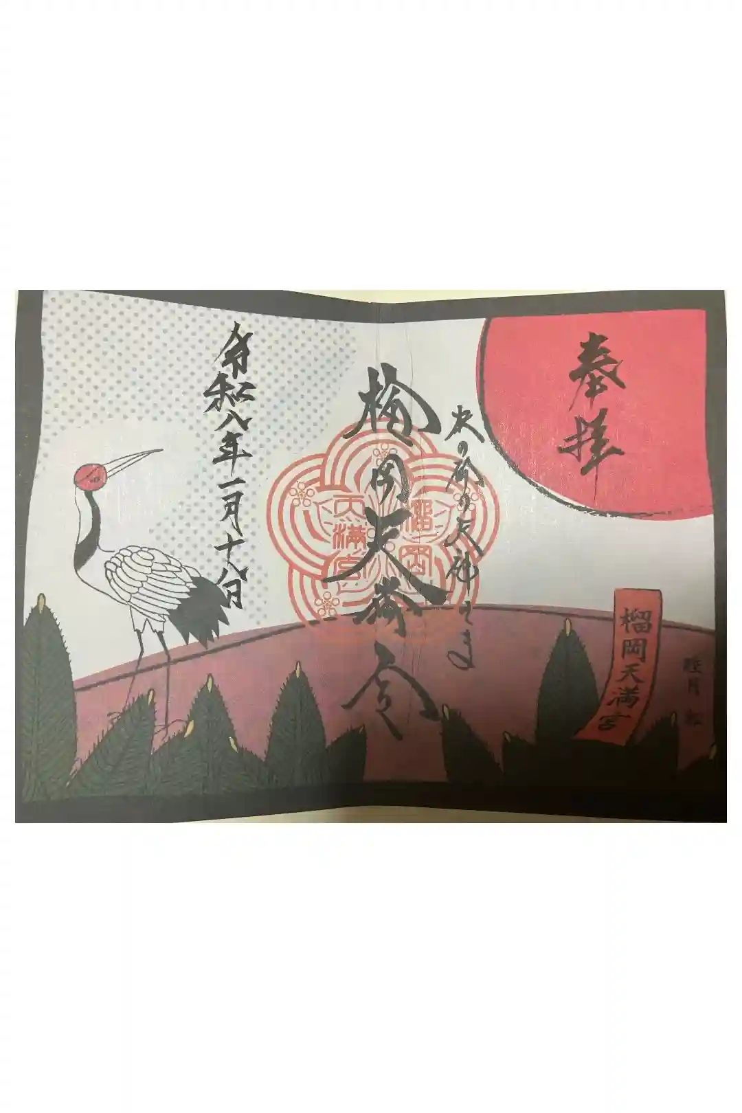 右から順に、「奉拝」「杜の都の天神さま」「榴岡天満宮」に加えて、おまつりされている菅原道真公が詠んだ「東風吹かばにほひおこせよ梅の花 あるじなしとて春な忘れそ」のうたが書かれている見開きの御朱印です。 | |||