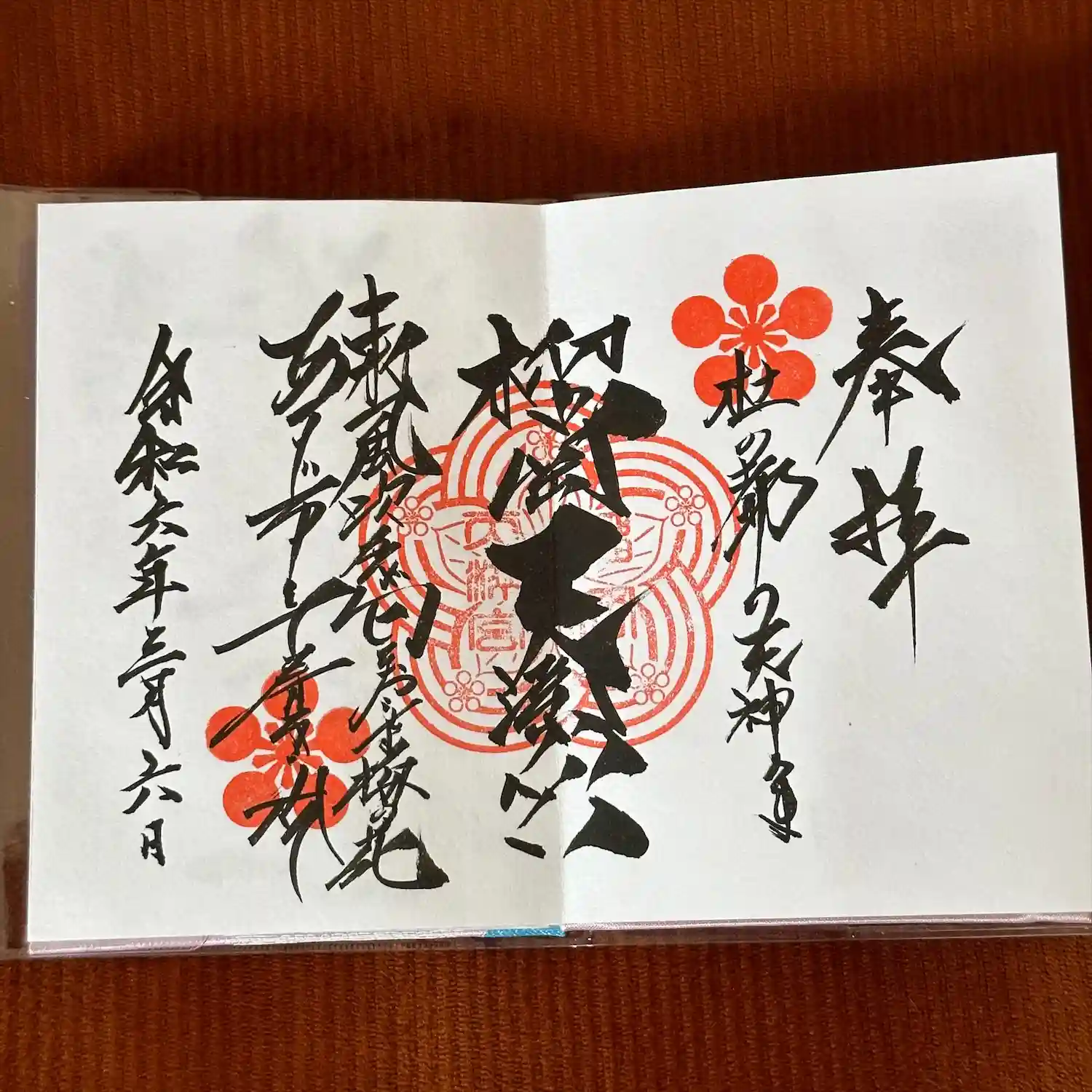 手書きの2ページの御朱印。梅の印が素敵