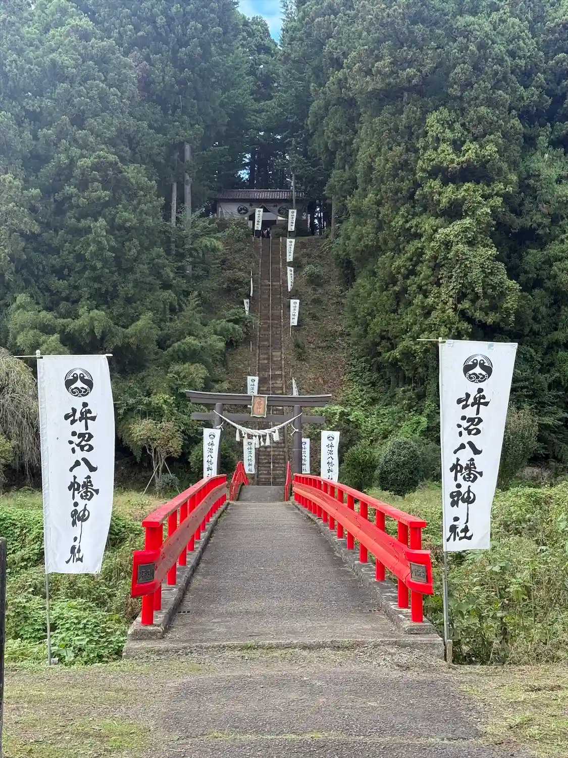 坪沼川を渡り小高い山の上に鎮座する社殿へ向かうアプローチが厳かな雰囲気😊