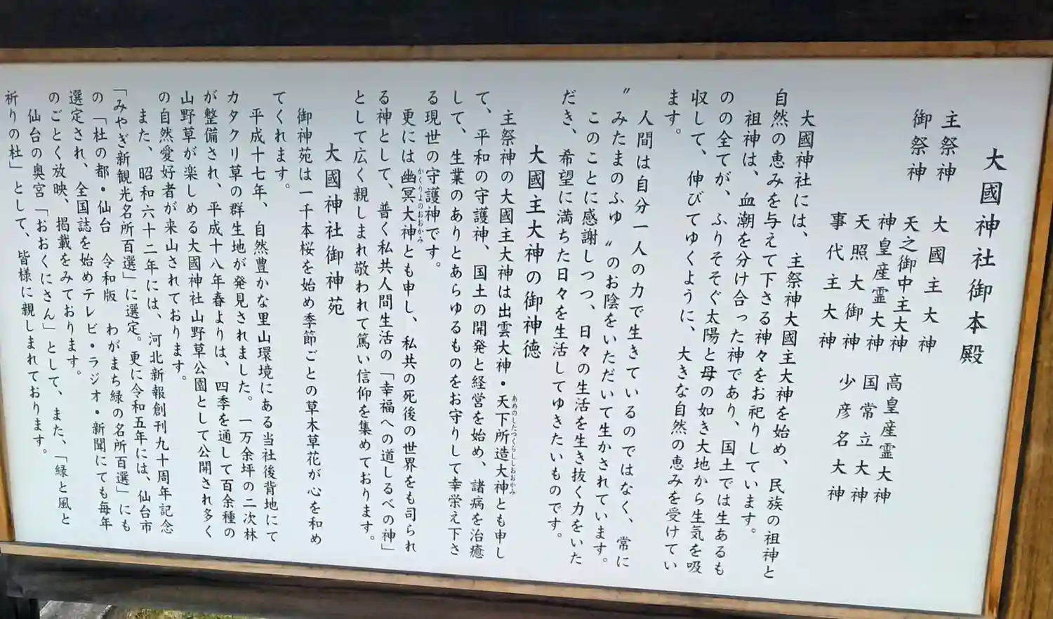 大國神社 大國神社御本殿、主祭神、御祭神について書かれてます