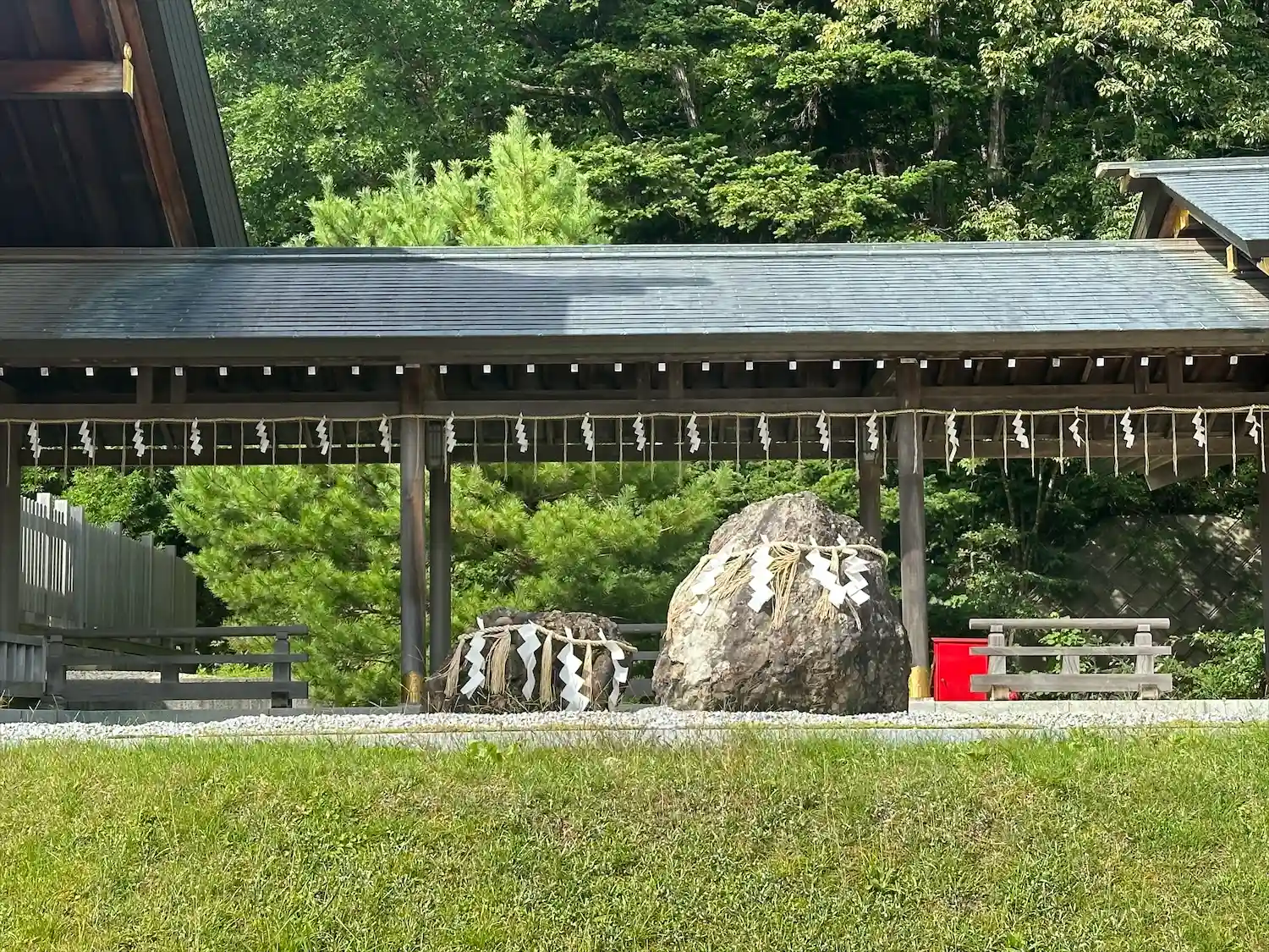 社殿からつながる右翼廊と神石